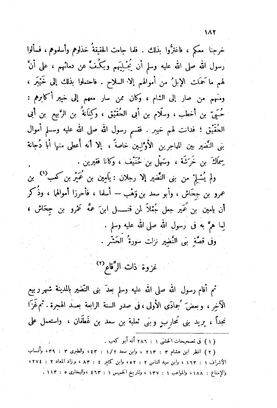 (2) انظر ابن هشام 3: 213، وابن سعد 2 / 1: 43، والطبري 3: 39، وأنساب الأشراف 1: 163، وابن سيد الناس 2: 52، وابن كثير 4: 83، وزاد المعاد 2: 274، والإمتاع: 188، والمواهب 1: 137، وتاريخ الخميس 1: 463، والبخاري 5: 113.