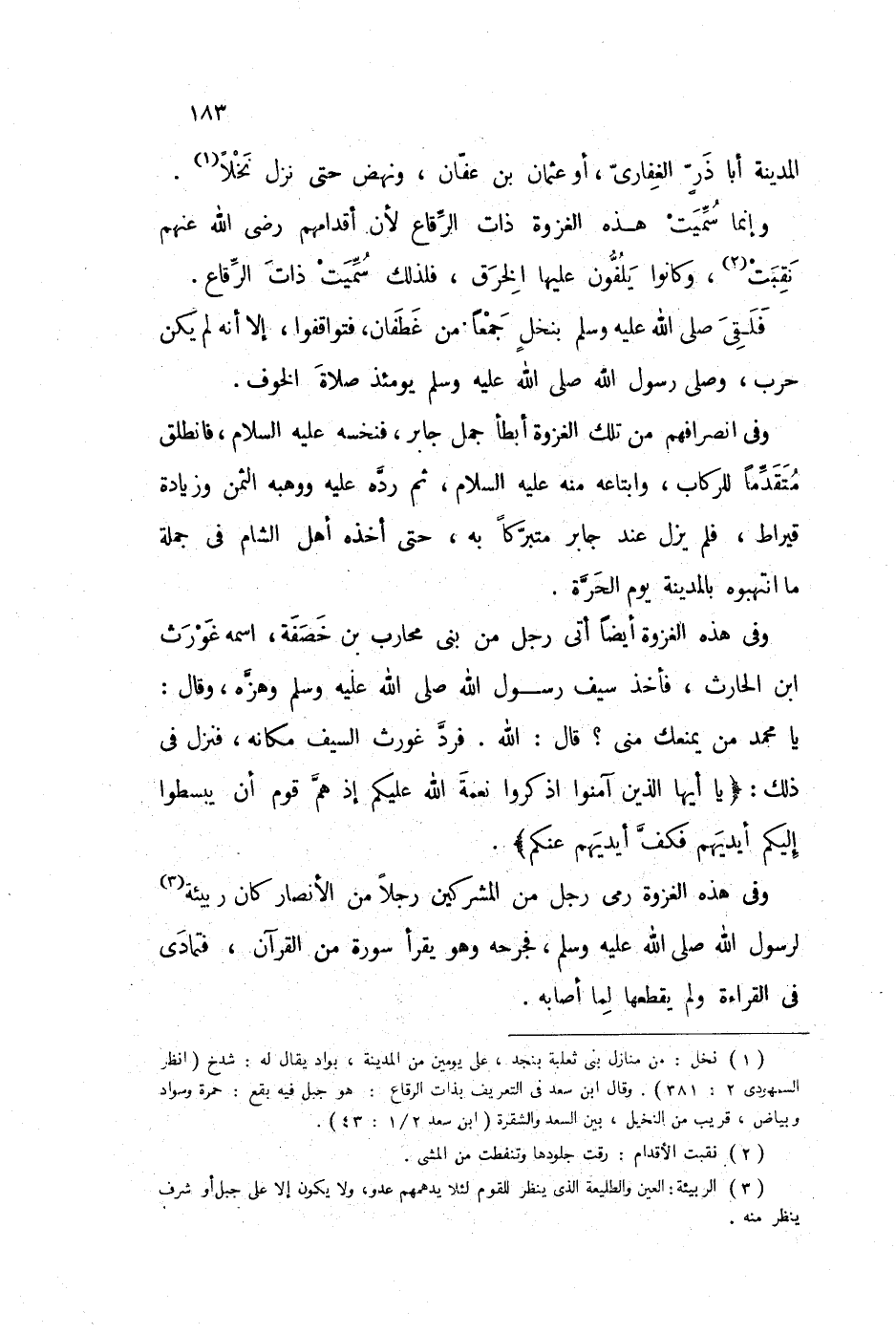 (1) نخل: من منازل بني ثعلبة بنجد، على يمين من المدينة، بواد يقال له: شدخ (انظر السمهودي 2: 381) . وقال ابن سعد في التعريف بذات الرقاع: هو جبل فيه بقع: حمرة وسواد وبياض، قريب من النخيل، بين السعد والشقرة (ابن سعد 2 / 1: 43) .