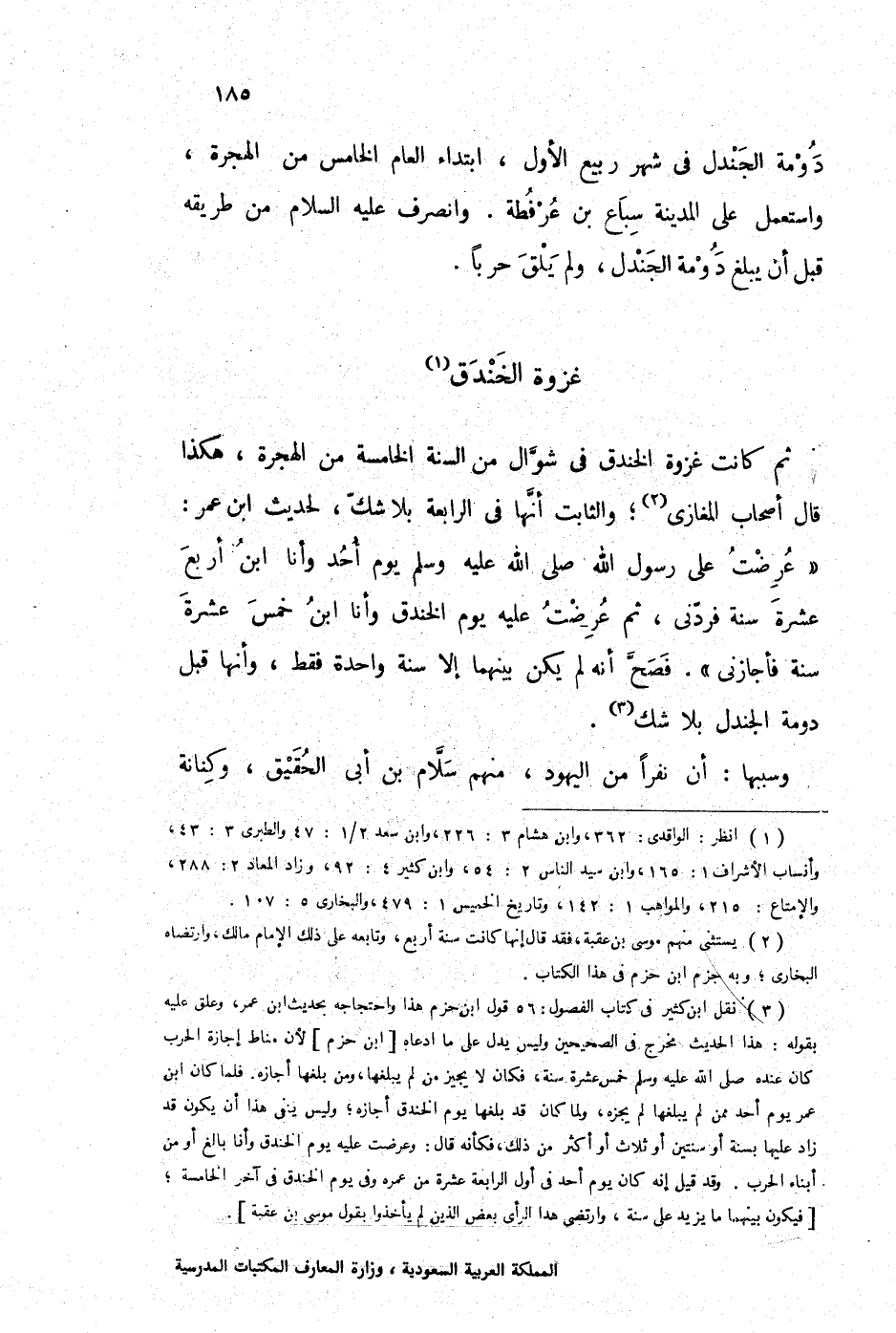 (2) يستثنى منهم موسى بن عقبة، فقد قال إنها كانت سنة أربع، وتابعه على ذلك الإمام مالك، وارتضاه البخاري؛ وبه حزم في هذا الكتاب.