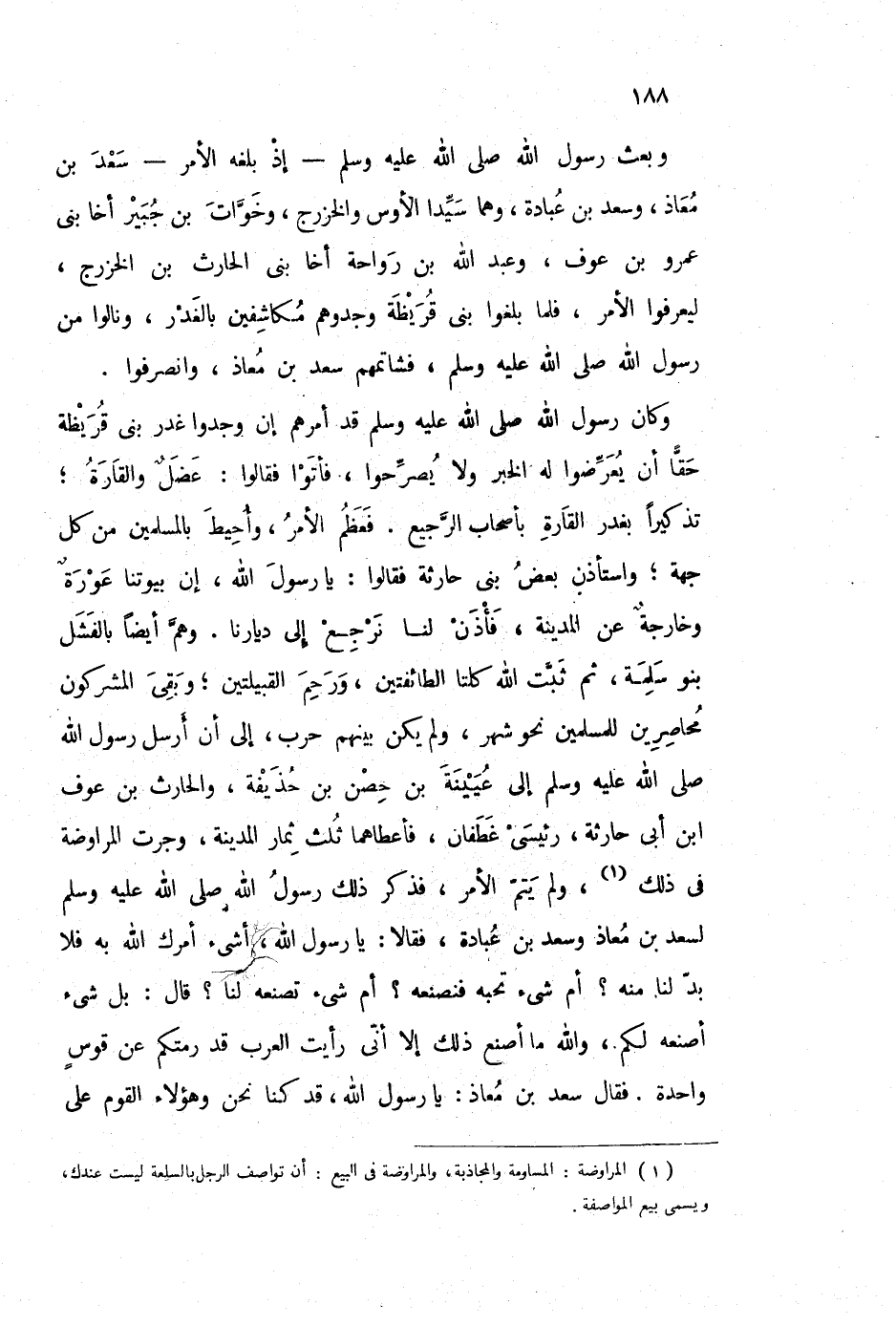وكان رسول الله صلى الله عليه وسلم قد أمرهم إن وجدوا غدر بني قريظة حقاً أن يعرضوا له الخبر ولا يصرحوا، فأتوا فقالوا: عضل والقارة؛ تذكيراً بغدر القارة بأصحاب الرجيع. فعظم الأمر، وأحيط بالمسلمين من كل جهة؛ واستأذن بعض بني حارثة فقالوا: يا رسول الله، إن بيوتنا عورة وخارجة عن المدينة، فأذن لنا نرجع إلى ديارنا. وهم أيضاً بالفشل بنو سلمة، ثم ثبت الله كلتا الطائفتين، ورحم القبيلتين؛ وبقى المشركون محاصرين للمسلمين نحو شهر، ولم يكن بينهم حرب، إلى أن رسل رسول الله صلى الله عليه وسلم إلى عيينة بن حصن بن حذيفة، والحارث بن عوف ابن أبي حارثة، رئيسي غطفان، فأعطاهما ثلث ثمار المدينة، وجرت المراوضة في ذلك (1) ، ولم يتم الأمر، فذكر ذلك رسول الله صلى الله عليه وسلم لسعد بن معاذ وسعد بن عبادة، فقالا: يا رسول الله، أشيء أمرك الله به فلا بد لنا منه أم شيء تحبه فنصنعه أم شيء تصنعه لنا قال: بل شيء أصنعه لكم، والله ما أصنع ذلك إلا أني رأيت العرب قد رمتكم عن قوس واحدة. فقال سعد بن معاذ: يا رسول الله، قد كنا نحن وهؤلاء القوم على