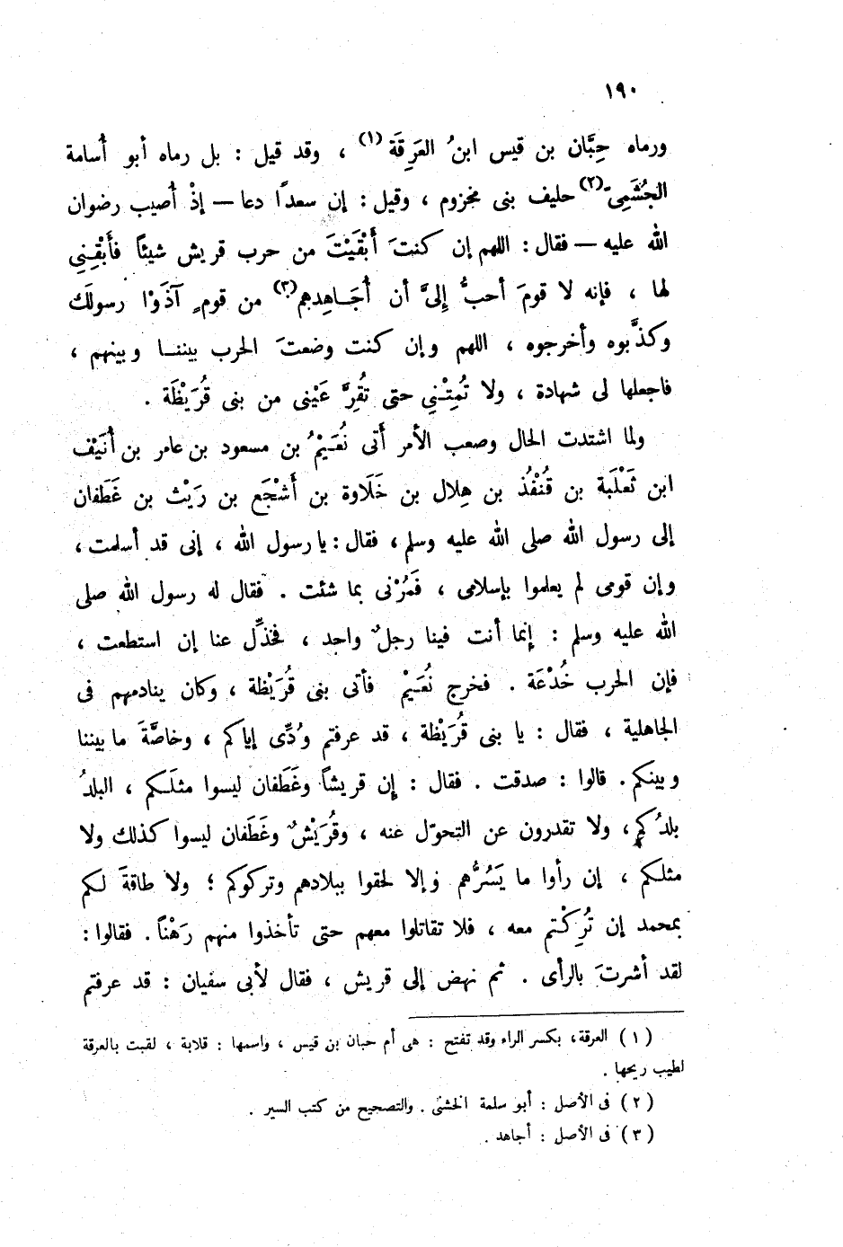 ورماه حبان بن قيس ابن العرقة (1) ، وقد قيل: بل رماه أبو أسامة الجشمي (2) حليف بني مخزوم، وقيل: إن سعداً دعا إذ أصيب رضوان الله عليه فقال: اللهم إن كنت أبقيت من حرب قريش شيئاً فأبقني لها، فإنه لا قوم أحب إلى أن أجاهدهم (3) من قوم آذوا رسولك وكذبوه وأخرجوه، اللهم وإن كنت وضعت الحرب بيننا وبينهم، فاجعلها لي شهادة، ولا تمتني حتى تقر عيني من بني قريظة.