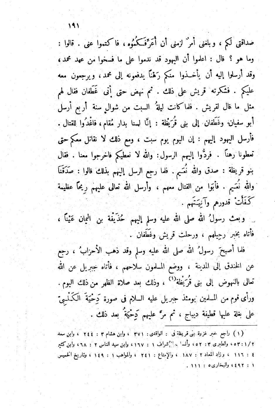 (1) راجع خبر غزوة بني قريظة في: الواقدي: 371، وابن هشام 3: 244، وابن سعد 2 / 1: 53، والطبري 3: 52، وأنساب الأشراف 1: 167ن وابن سيد الناس 2: 68، وابن كثير 4: 116، وزاد المعاد 2: 187، والإمتاع: 241، والمواهب 1: 149، وتاريخ الخميس 1: 492، والبخاري 5: 111.