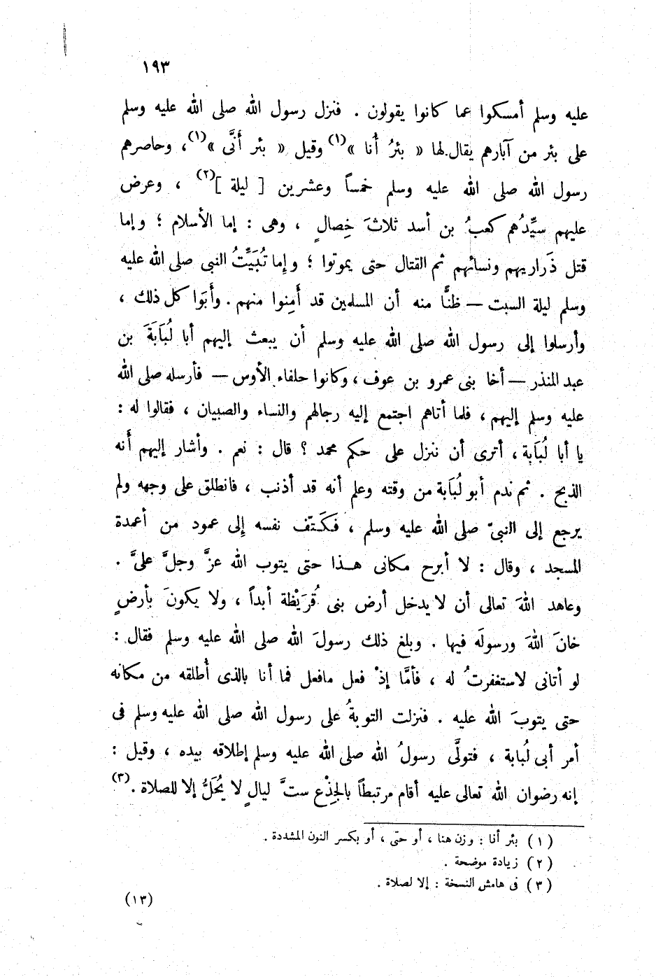 عليه وسلم أمسكوا عما كانوا يقولون. فنزل رسول الله صلى الله عليه وسلم على بئر من آبارهم يقال لها " بئر أنا " (1) وقيل " بئر أني "، وحاصرهم رسول الله صلى الله عليه وسلم خمساً وعشرين [ليلة] (2) ، وعرض عليهم سيدهم كعب بن أسد ثلاث خصال، وهي: إما الأسلام؛ وإما قتل ذراريهم ونسائهم ثم القتال حتى يموتوا؛ وإما تبيت النبي صلى الله عليه وسلم ليلة السبت ظنا منه أن المسلمين قد أمنوا منهم. وأبوا كل ذلك، وأرسلوا إلى رسول الله صلى الله عليه وسلم أن يبعث إليهم أبا لبابة بن عبد المنذر أخا بني عمرو بن عوف، وكانوا حلفاء الأوس فأرسله صلى الله عليه وسلم إليهم، فلما أتاهم أجتمع إليه رجالهم والنساء والصبيان، فقالوا له: يا أبا لبابة، أترى أن ننزل على حكم محمد قال: نعم. أشار إليهم أنه الذبح. ثم ندم أبو لبابة من وقته وعلم أنه قد أذنب، فانطلق على وجهه ولم يرجع إلى النبي صلى الله عليه وسلم، فكتف نفسه إلى عمود من أعمدة المسجد، وقال: لا أبرح مكاني هذا حتى يتوب الله عز وجل عليّ. وعاهد الله تعالى أن لا يدخل أرض بني قريظة أبداً، ولا يكون بأرض خان الله ورسوله فيها. وبلغ ذلك رسول الله صلى الله عليه وسلم فقال: لو أتاني لا ستغفرت له، فأما إذ فعل ما فعل فما أنا بالذي أطلقعه من مكانه حتى يتوب الله عليه. فنزلت التوبة على رسول الله صلى الله عليه وسلم في أمر أبي لبابة، فتولى رسول الله صلى الله عليه وسلم إطلاقه بيده، وقيل: إنه رضوان الله تعالى عليه أقام مرتبطاً بالجذع ست ليالٍ لا يحل إلا للصلاة. (3) .