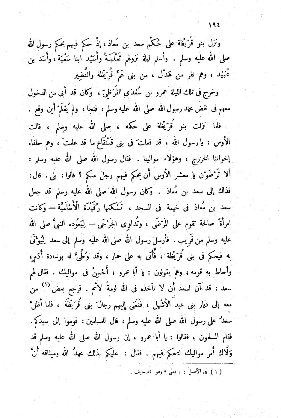 فلما نزلت بنو قريظة على حكمه، صلى الله عليه وسلم، قالت الأوس: يا رسول الله، قد فعلت في بني قينقاع ما قد علمت، وهم حلفاء إخواننا الخزرج، وهؤلاء موالينا. فقال رسول الله صلى الله عليه وسلم: ألا ترضون يا معشر الأوس أن يحكم فيهم رجل منكم قالوا: بلى. قال: فذاك إلى سعد بن معاذ. وكان رسول الله صلى الله عليه وسلم قد جعل سعد بن معاذ في خيمة في المسجد، تسكنها رفيدة الأسلمية وكانت امرأة صالحة تقوم على المرضى، وتداوي الجرحى ليعوده النبي صلى الله عليه وسلممن قريب. فأرسل رسول الله صلى الله عليه وسلم إلى سعد ليؤتي به فيكم في بني قريظة، فأتى به على حمار، وقد وطئ له بوسادة أدم، وأحاط به قومه، وهم يقولون: يا أبا عمرو، أحسن في مواليك. فقال لهم سعد: قد آن لسعد أن لا تأخذه في الله لومة لائم. فرجع بعض (1) من معه إلى ديار بني عبد الأشهل، فنعى إليهم رجال بني قريظة، فلما أظل سعد على رسول الله صلى الله عليه وسلم، قال للمسلمين: قوموا إلى سيدكم. فقام المسلمون، فقالوا: يا أبا عمرو، إن رسول الله صلى الله عليه وسلم قد ولاك أمر مواليك لتحكم فيهم. فقال: عليكم بذلك عهد الله وميثاقه أن