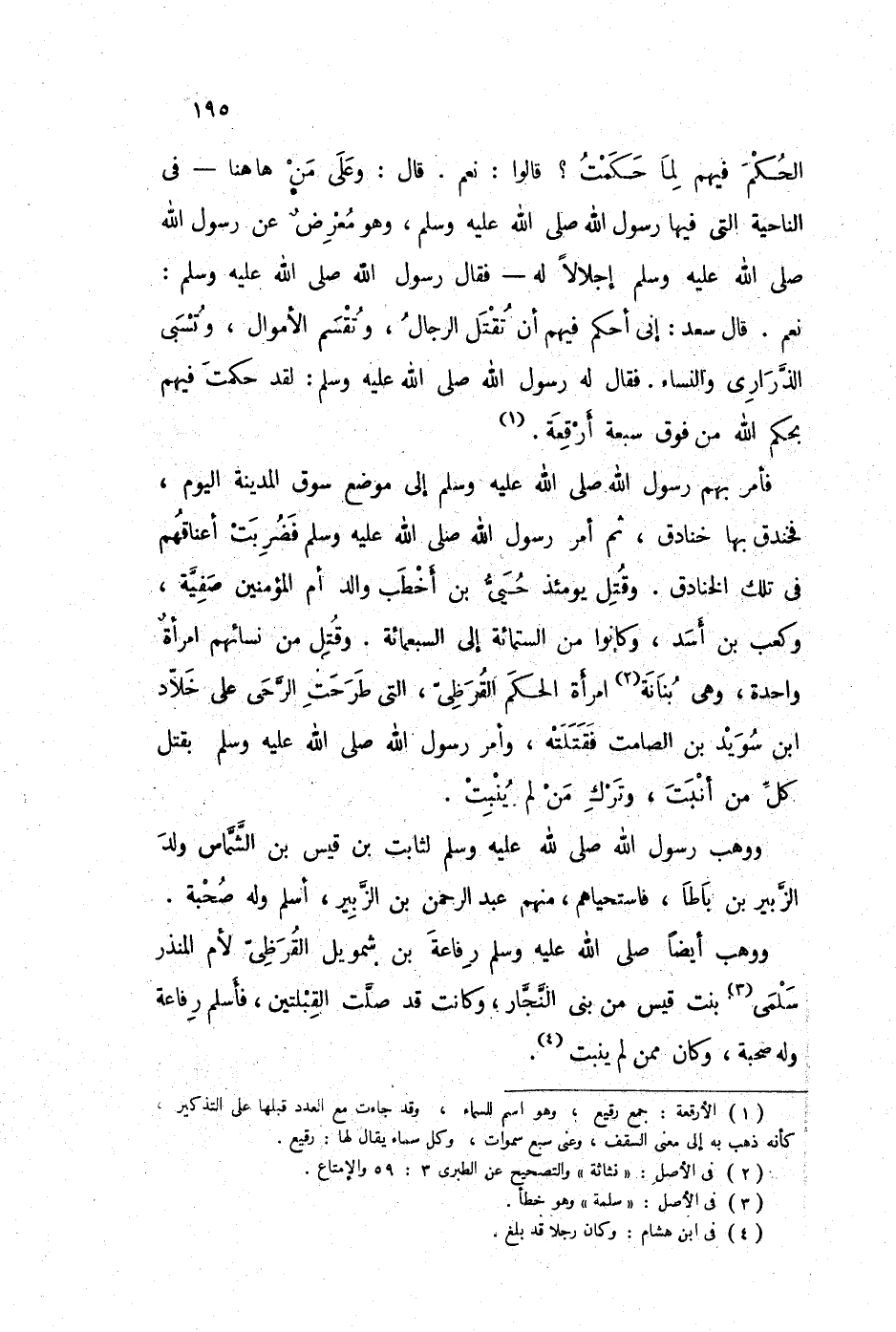 فأمر بهم رسول الله صلى الله عليه وسلم إلى موضع سوق المدينة اليوم، فخندق بها خنادق، ثم أمر رسول الله صلى الله عليه وسلم فضربت أعناقهم في تلك الخنادق. وقتل يومئذ حيي بن أحطب والد أم المؤمنين صفية، وكعب بن أسد، وكانوا من الستمائة إلى السبعمائة. وقتل من نسائهم امرأة واحدة، وهي بنابة (2) امرأة الحكم القرظي، التي طرحت الرحى على خلاد ابن سويد بن الصامت فقتلته، وأمر رسول الله صلى الله عليه وسلم بقتل كل من أنبت، وترك من لم ينبت.