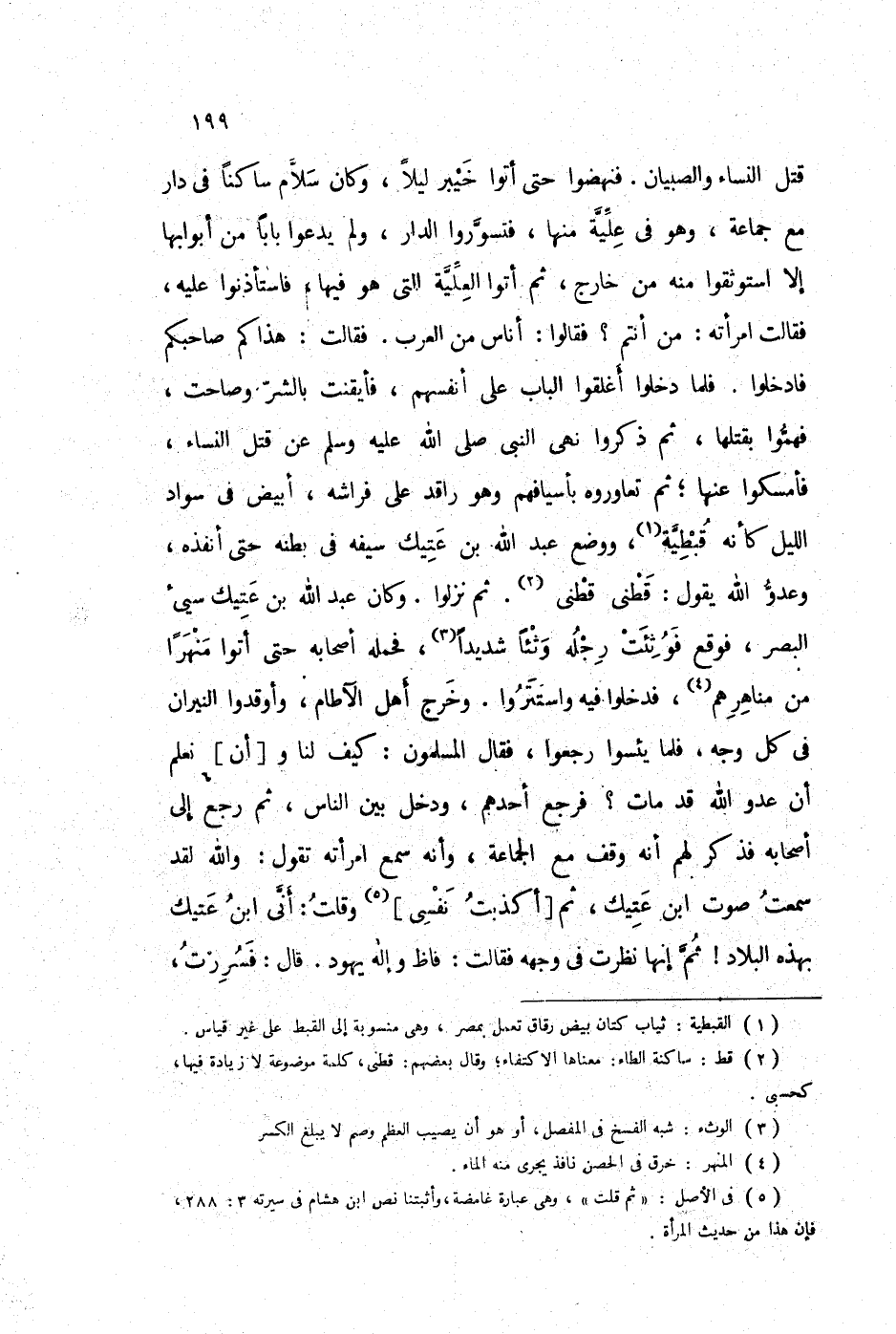 قتل النساء والصبيان. فنهضوا حتى أتوا خيبر ليلاً، وكان سلام ساكناً في دار مع جماعة، وهو في علية منها، فتسوروا الدار، ولم يدعوا باباً من أبوابها إلا استوثقوا منه في خارج، ثم أتوا العلية التي هو فيها، فاستأذنوا عليه، فقالت امرأته: من أنتم فقالوا: أناس من العرب. فقالت: هذاكم صاحبكم فادخلوا. فلما دخلوا أغلقوا الباب على أنفسهم، فأيقنت بالشر وصاحت فهموا بقتلها، ثم ذكروا نهى النبي صلى الله عليه وسلم عن قتل النساء، فأمسكوا عنها؛ ثم تعاوروه بأسيافهم وهو راقد على فراشه، أبيض في سواد الليل كأنه قبطية (1) ، ووضع عبد الله بن عتيك سيفه في بطنه حتى أنفذه، وعدو الله يقول: قطني قطني (2) . ثم نزلوا. وكان عبد الله بن عتيك سيء البصر، فوقع فوثئت رجله وثئا شديداً (3) ، فحمله أصحابه حتى أتوا منهراً من مناهرهم (4) ، فدخلوا فيه استتروا. وخرج أهل الآطام، وأوقدوا النيران في كل وجه، فلما يئسوا رجعوا، فقال المسلمون: كيف لنا و [أن] نعلم أن عدو الله قد مات فرجع أحدهم، ودخل بين الناس، ثم رجع إلى أصحابه فذكر لهم أنه وقف مع الجماعة، وأنه سمع امرأته تقول: والله لقد سمعت صوت ابن عتيك، ثم [أكذبت نفسي] (5) وقلت: أني ابن عتيك بهذه البلاد! ثم إنها نظرت في وجهه فقالت: فاظ وإله يهود. قال: فسررت،