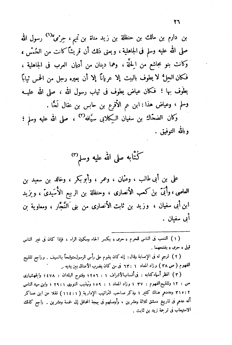 (3) انظر أسماء كتابه: في أنساب الأشراف 1: 256؛ وفتوح البلدان: 478؛ والجهشياري ص: 12 وتلقيح الفهوم: 37؛ وزاد المعاد 1: 59؛ وتهذيب النووي 1: 29؛ وابن سيد الناس 2: 315 وعددهم هناك كثير؛ وذكر صاحب التراتيب الإدارية (1: 114) نقلاً عن ابن عساكر أنه عدهم في تاريخ دمشق ثلاث وعشرين، وأوصلهم في بهجة المحافل إلى خمسة وعشرين. راجع كذلك الاستيعاب في ترجمة زيد بن ثابت.