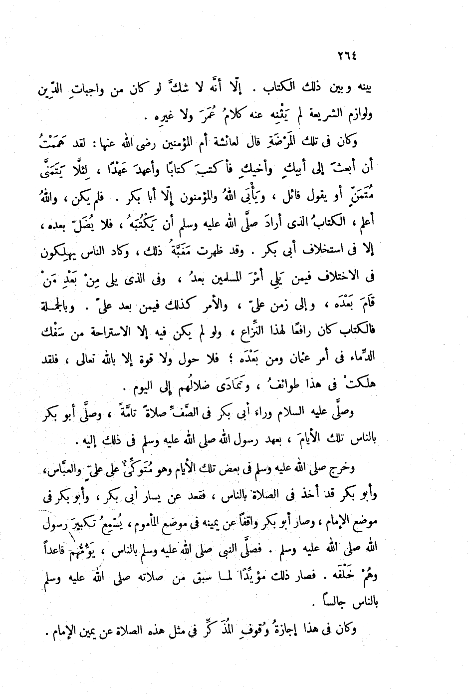 وكان في تلك المرضة قال لعائشة أم المؤمنين رضي الله عنها: لقد هممت أن أبعث إلى أبيك وأخيك فأكتب كتاباً وأعهد عهداً، لئلا يتمنى متمن أو يقول قائل، ويأبى الله والمؤمنون إلا أبا بكر. فلم يكن، والله أعلم، الكتاب الذي أراد صلى الله عليه وسلم أن يكتبه، فلا يضل بعده، إلا في استخلاف أبي بكر. وقد ظهرت مغبة ذلك، وكاد الناس يهلكون في الاختلاف فيمن يلي أمر المسلمين بعد، وفي الذي يلي من بعد من قام بعده، وإلى زمن علي، والأمر كذلك فيمن بعد علي. وبالجملة فالكتاب كان رافعاً لهذا النزاع، ولو لم يكن فيه إلا استراحة من سفك الدماء في أمر عثمان ومن بعده؛ فلا حول ولا قوة إلا بالله تعالى، فلقد هلكت في هذا طوائف، وتمادى ضلالهم إلى اليوم.
