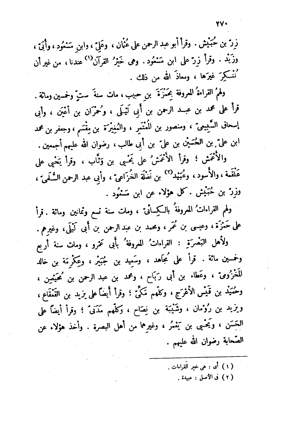 زر بن حبيش. وقرأ أبو عبد الرحمن على عثمان، وعلي، وابن مسعود، وأبي، وزيد. وقرأ زر على ابن مسعود. وهي خير القرآن (1) عندنا، من غير أن ننكر غيرها، ومعاذ الله من ذلك.