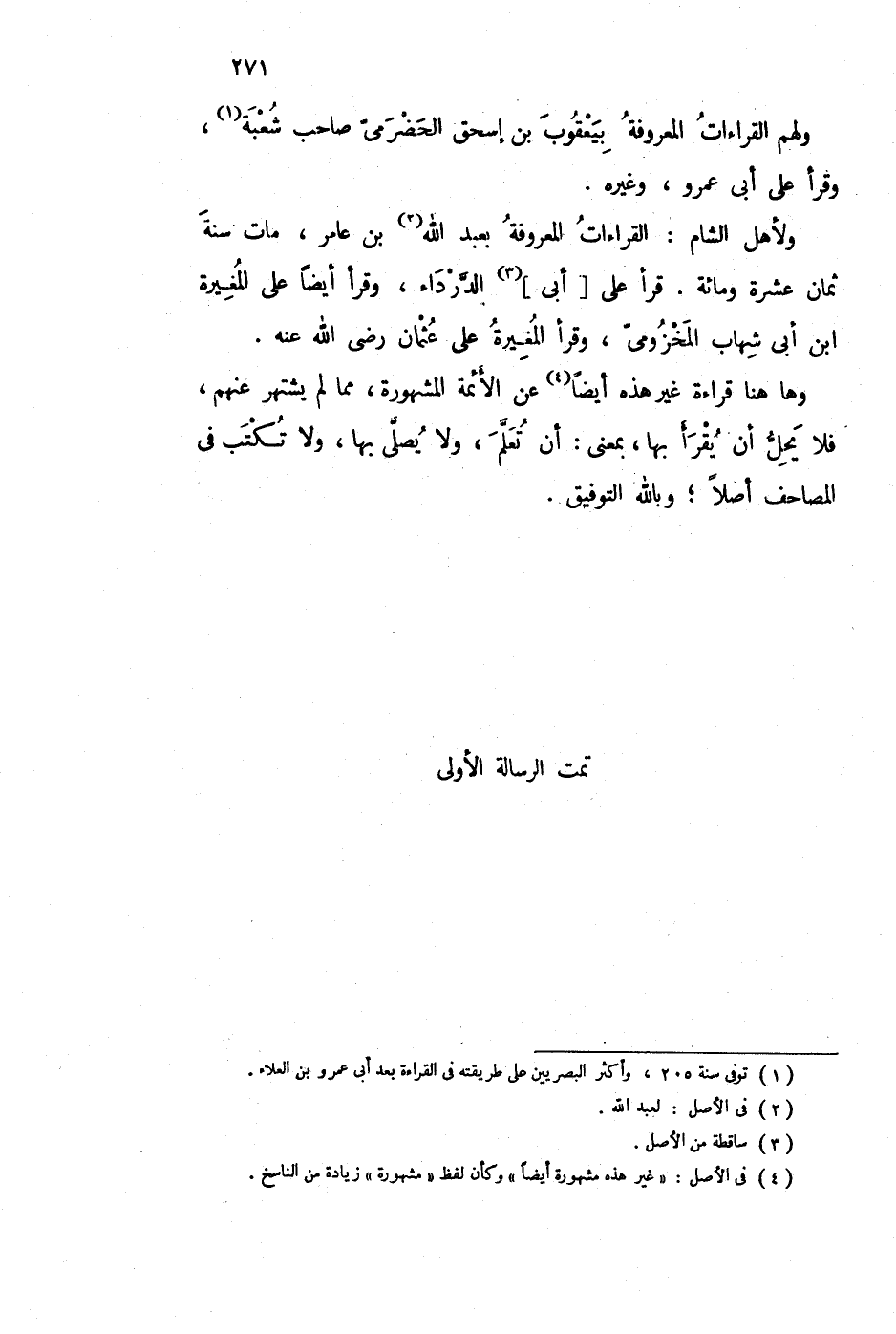 وها هنا قراءة غير هذه أيضاً (4) عن الأئمة المشهورة، مما لم يشتهر عنهم، فلا يحل أن يقرأ بها، بمعنى: أن تعلم، ولا يصلي بها، ولا تكتب في المصاحف أصلاً؛ وبالله التوفيق.