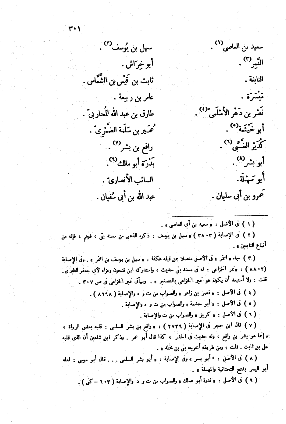 (3) جاء " النمر " في الأصل متصلا بمن قبله هكذا: " سهل بن يوسف بن النمر ". وفي الإصابة (8802) : " نمر الخزاعي: له في مسند بقي حديث، واستدركه ابن فحون وعزاه لأبي جعفر الطبري، قلت: ولا أستبعد أن يكون هو نمير الخزاعي بالتصغير ". وسيأتي نمير الخزاعي في ص 307.