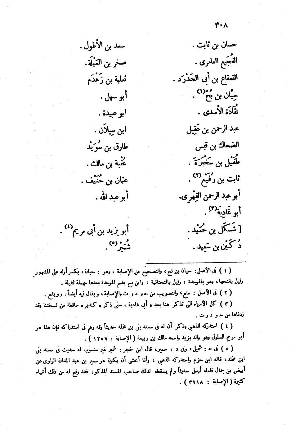 (5) في ح: شميل، وفي د: سمير، قال ابن حجر: شمير غير منسوب له حديث في مسند بقي ابن مخلد، قاله ابن حزم واستدركه الذهبي، وأنا أخشى أن يكون هو سمير بن عبد المدان الراوي عن أبيض بن جمال فلعله أرسل حديثاً ولم يسقطه لذلك صاحب المسند المذكور فقد وقع له من ذلك أشياء كثيرة (الإصابة: 3918) .