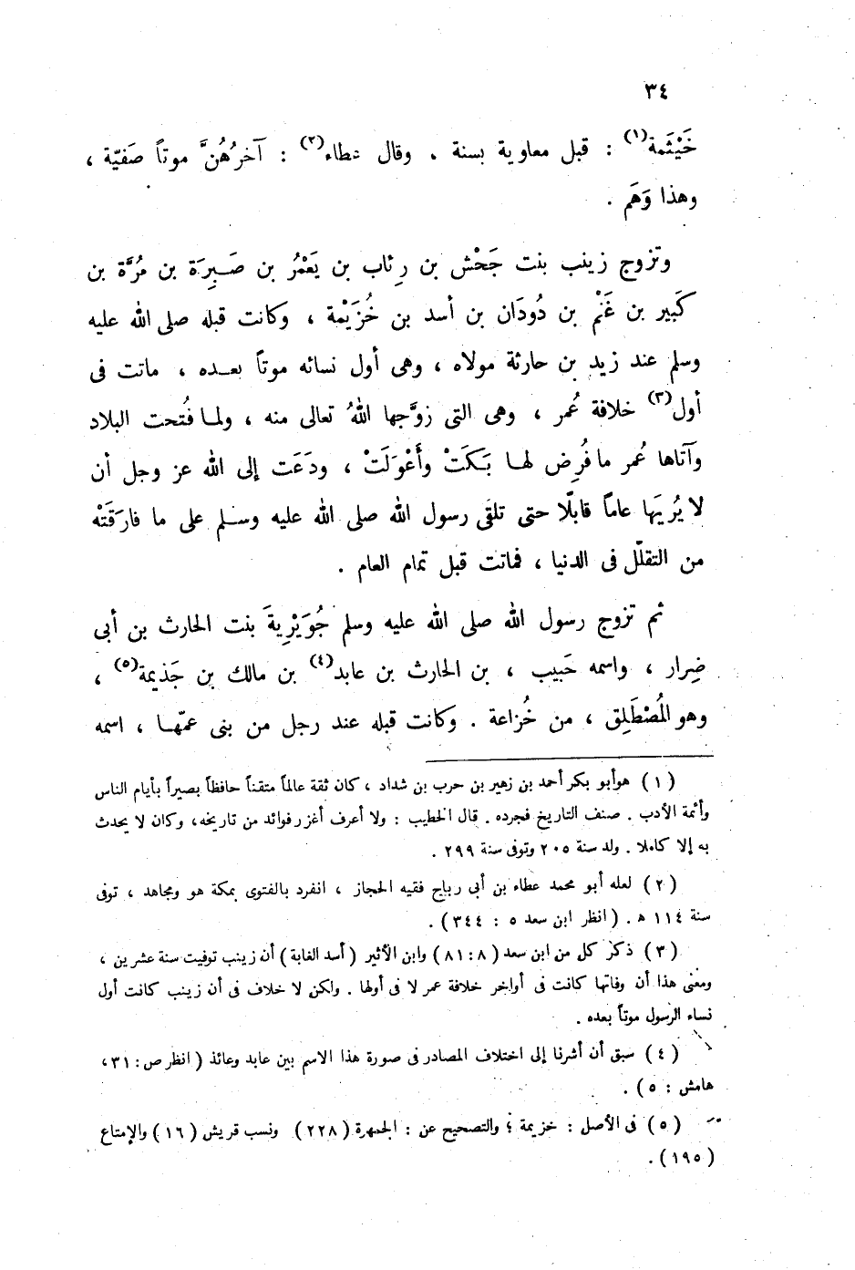 (3) ذكر كل من ابن سعد (8: 81) وابن الأثير (أسد الغابة) أن زينب توفيت سنة عشرين، ومعنى هذا أن وفاتها كانت في أواخر خلافة عمر لا في أولها. ولكن لا خلاف في أن زينب كانت أول نساء الرسول موتاً بعده.