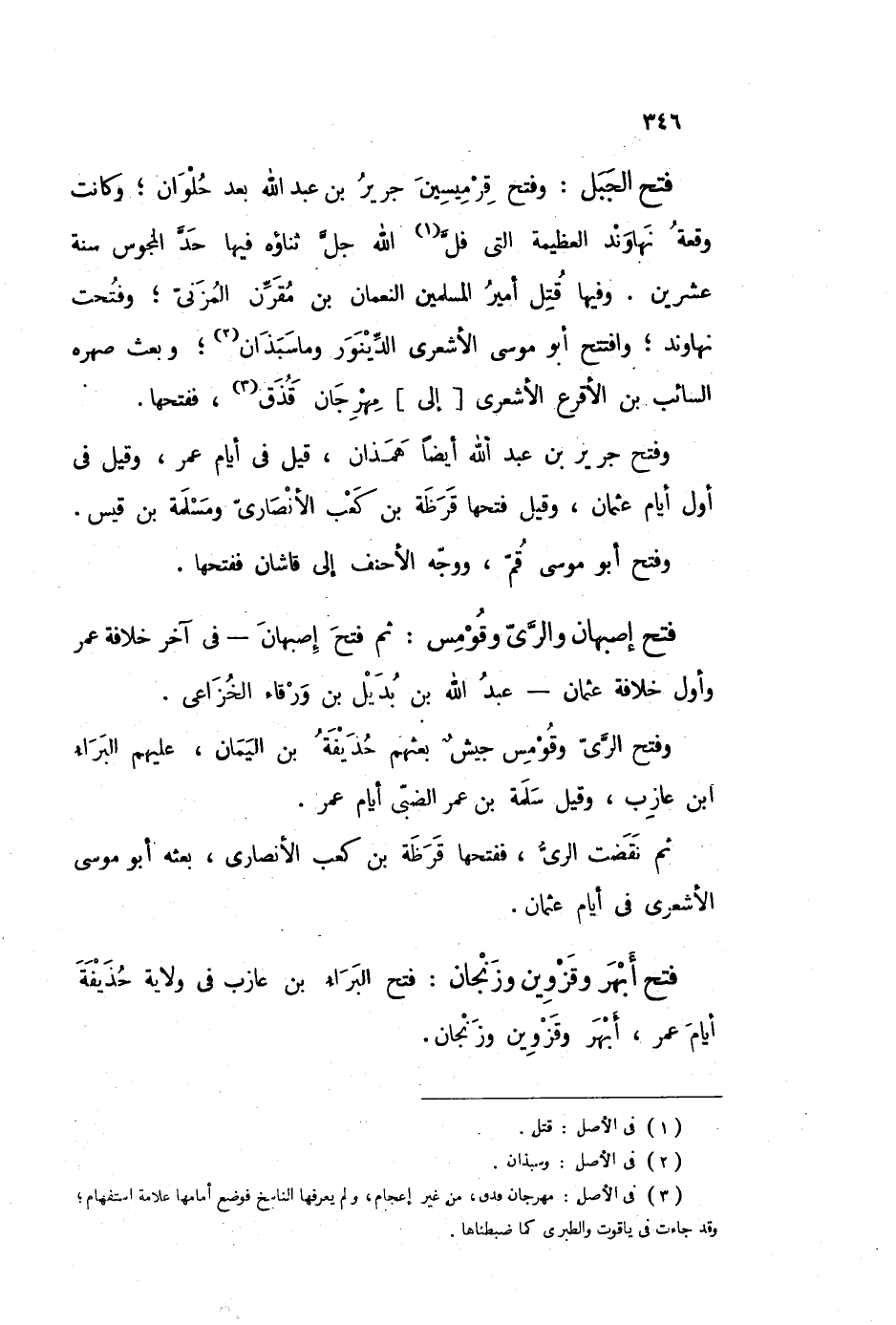 فتح الجبل: وفتح قرميسين جرير بن عبد الله بن حلوان؛ وكانت وقعة نهاوند العظيمة التي فل (1) الله جل ثناؤه فيها حد المجوس سنة عشرين. وفيها قتل أمير المسلمين النعمان بن مقرن المزني؛ وفتحت نهاوند؛ وافتتح أبو موسى الأشعري الدينور وماسبذان (2) ؛ وبعث صهره السائب بن الأقرع الأشعري [إلى] مهرجان قذق (3) ، ففتحها.