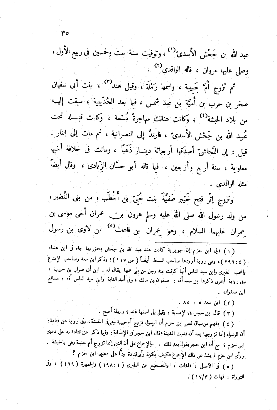 (4) يفهم من سياق نص ابن حزم أن الرسول تزوج أم حبيبة وهي في الحبشة، وفي رواية عن قتادة: أن الرسول إنما تزوجها بعد أن قدمت المدينة؛ قال ابن حجر في الإصابة: وفيما ذكر عن قتادة رد على دعوى ابن حزم؛ مع أن ابن حجر يقول بعد ذلك: والإجماع على أن النبي إنما تزوج أم حبيبة وهي بالحبشة. ورأى ابن حزم لم يشذ عن ذلك الإجماع فكيف يكون رأي قتادة رداً على دعوى ابن حزم