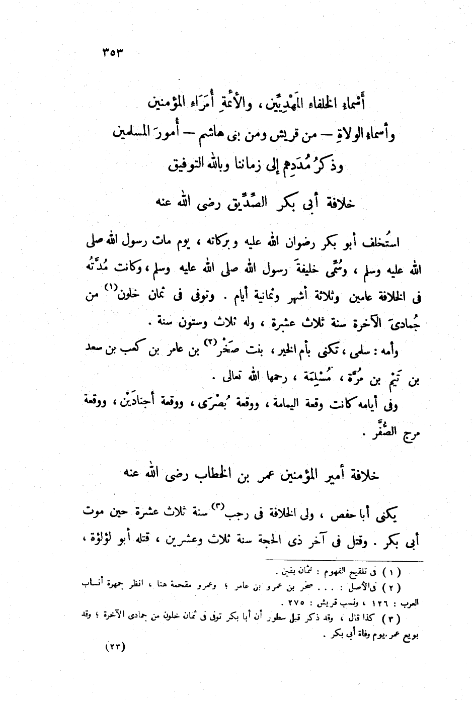 يكنى أبا حفص، ولي الخلافة في رجب (3) سنة ثلاث عشرة حين موت أبي كر. وقتل في آخر ذي الحجة سنة ثلاث وعشرين، قتله أبو لؤلؤة،