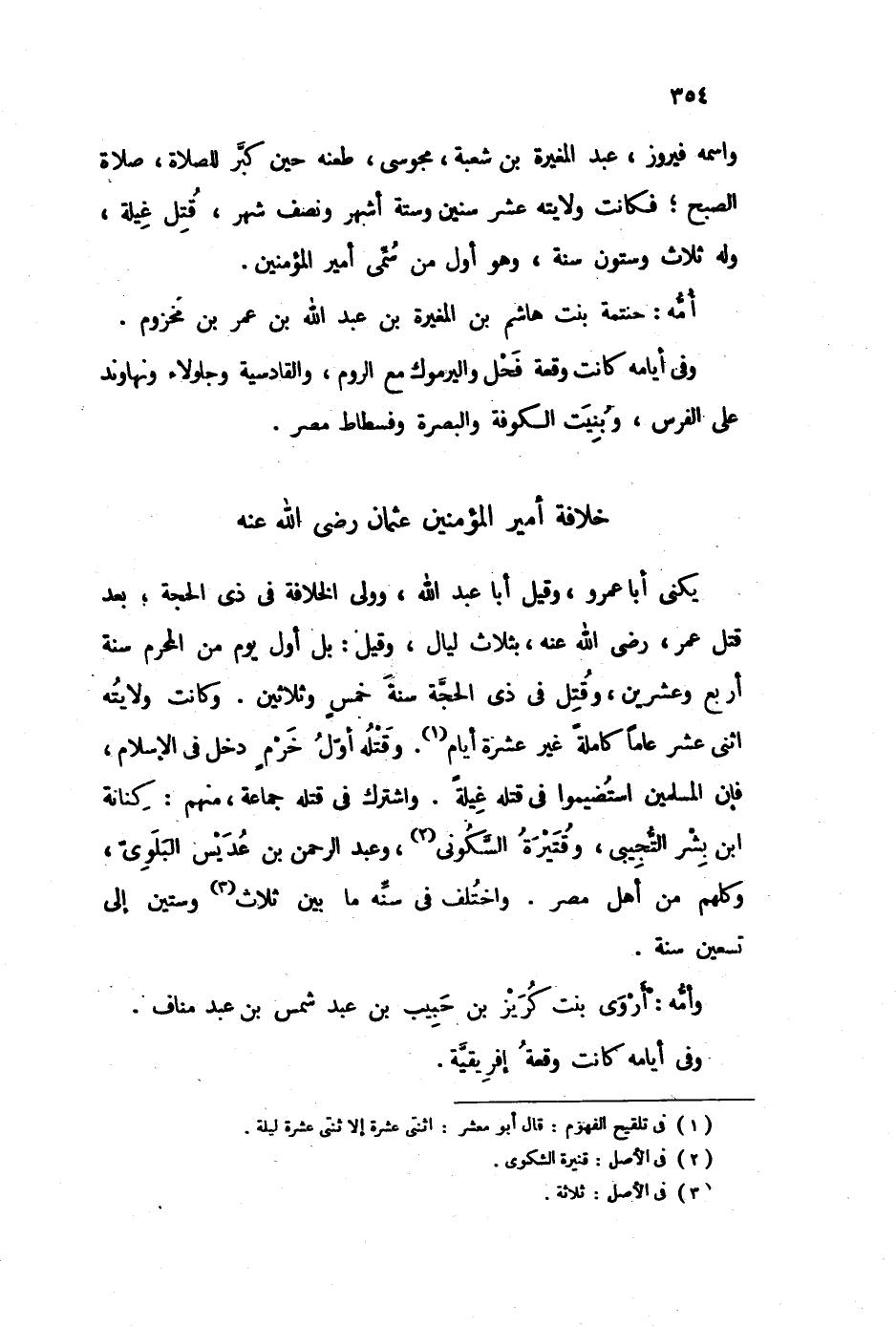 يكنى أبا عمرو، وقيل أبا عبد الله، وولي الخلافة في ذي الحجة، بعد قتل عمر، رضي الله عنه، بثلاث ليال، وقيل: بل أول يوم من المحرم سنة أربع وعشرين، وقتل في ذي الحجة سنة خمس وثلاثين. وكانت ولايته اثني عشر عاماً كاملة غير عشرة أيام (1) . وقتله أول خرم دخل في الإسلام، فإن المسلمين استضيموا في قتله غيلة. واشترك في قتله جماعة، منهم: كنانة ابن بشر التجيبي، وقتيرة السكوني (2) ، وعبد الرحمن بن عديس البلوي، وكلهم من أهل مصر. واختلف في سنه ما بين ثلاث (3) وستين إلى تسعين سنة.