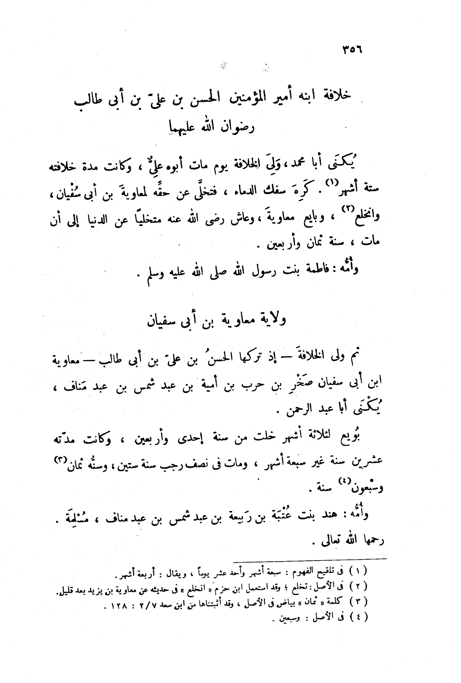 ثم ولي الخلافة إذ تركها الحسن بن علي بن أبي طالب معاوية ابن أبي سفيان صخر بن حرب بن أمية بن عبد شمس بن عبد مناف، يكنى أبا عبد الرحمن.