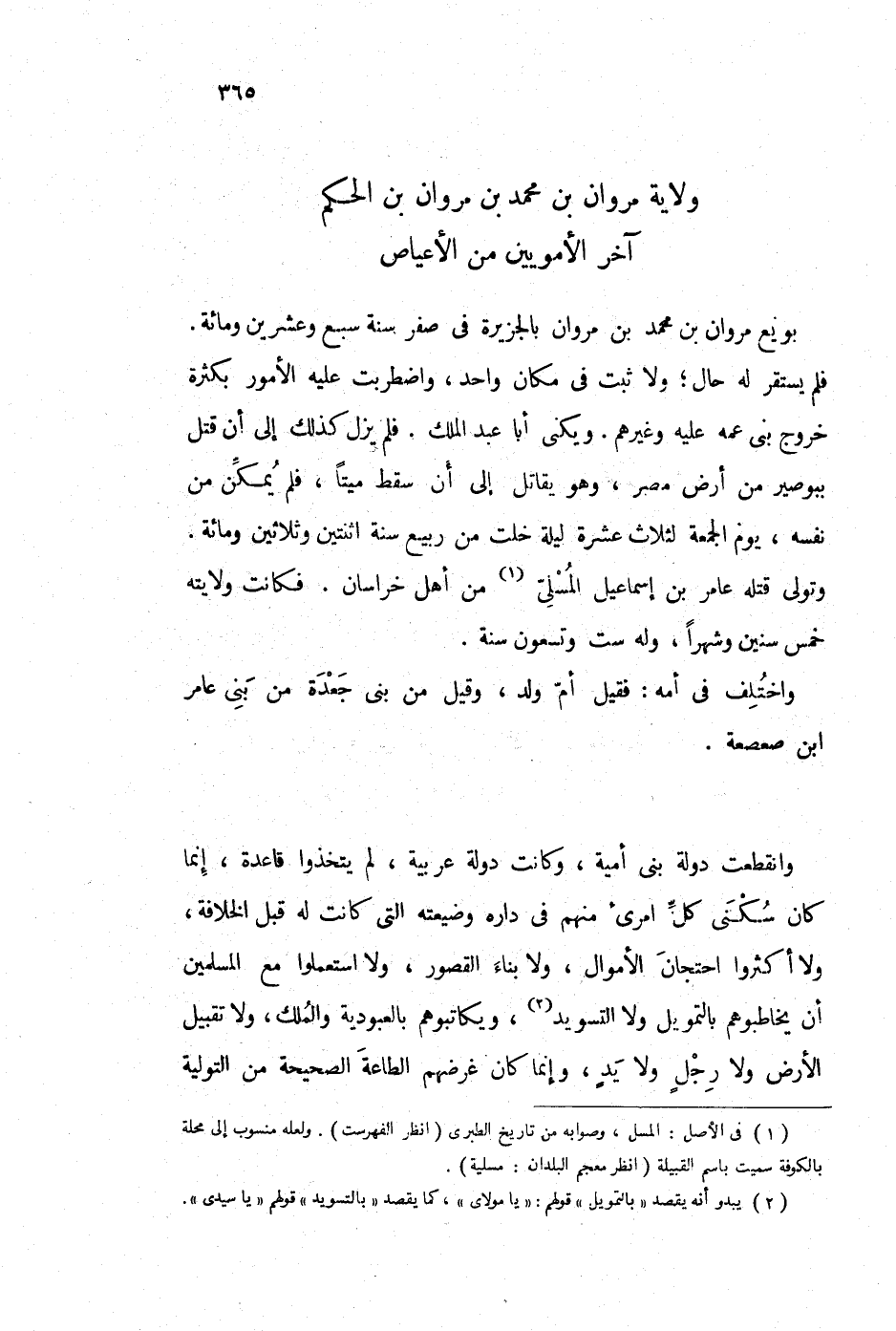 بويع مروان بن محمد بن مروان بالجزيرة في صفر سنة سبع وعشرين ومائة. فلم يستقر له حال؛ ولا ثبت في مكان واحد، واضطربت عليه الأمور بكثرة خروج بني عمه عليه وغيرهم. ويكنى أبا عبد الملك. فلم يزل كذلك إلى أن قتل ببوصير من أرض مصر، وهو يقاتل إلى أن سقط ميتاًن فلم يمكن من نفسه، يوم الجمعة لثلاث عشرة ليلة خلت من ربيع سنة اثنتين وثلاثين ومائة. وتولى قتله عامر بن إسماعيل المسلي (1) من أهل خراسان. فكانت ولايته خمس سنين وشهراً، وله ست وتسعون سنة.