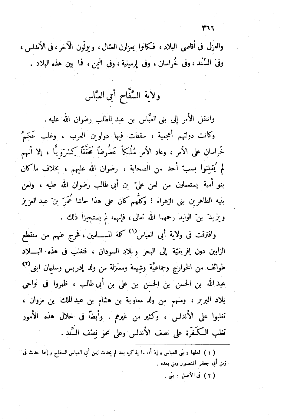 (1) لعلها " بني العباس " إذ أن ما يذكره بعد لم يحدث زمن أبي العباس السفاح وإنما حدث في زمن أبي جعفر المنصور ومن بعده.