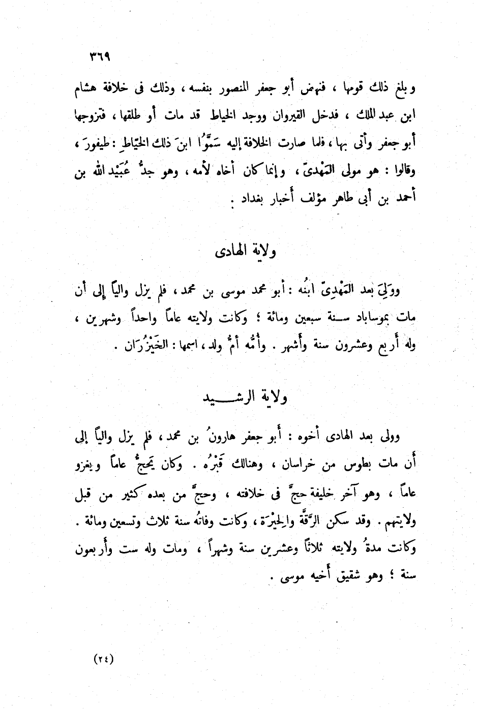 وولي بعد الهادي أخوه: أبو جعفر هارون بن محمد، فلم يزل والياص إلى أن مات بطوس من خراسان، وهنالك قبره. وكان يحج عاماً ويغزو عاماً، وهو آخر خليفة حج في خلافته، وحج من بعده كثير من قبل ولايتهم. وقد سكن الرقة والحيرة، وكانت وفاته سنة ثلاث وتسعين ومائة. وكانت مدى ولايته ثلاثاً وعشرين سنة وشهراً، ومات وله ست وأربعون سنة؛ وهو شقيق أخيه موسى.