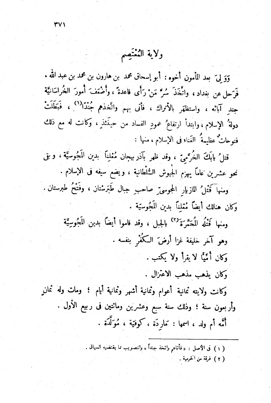وولي بعد المأمون أخوه: أبو إسحاق محمد بن هارون بن محمد بن عبد الله، فرحل عن بغداد، واتخذ سر من رأى قاعدة، وأضعف أمور الخراسانية جند آبائه، واستظهر بالأتراك، فأتى بهم واتخذهم جنداً (1) ، فبطلت دولة الإسلام، وابتدأ ارتفاع عمود الفساد من حينئذ، وكانت له مع ذلك فتوحات عظيمة الغناء في الإسلام، منها: