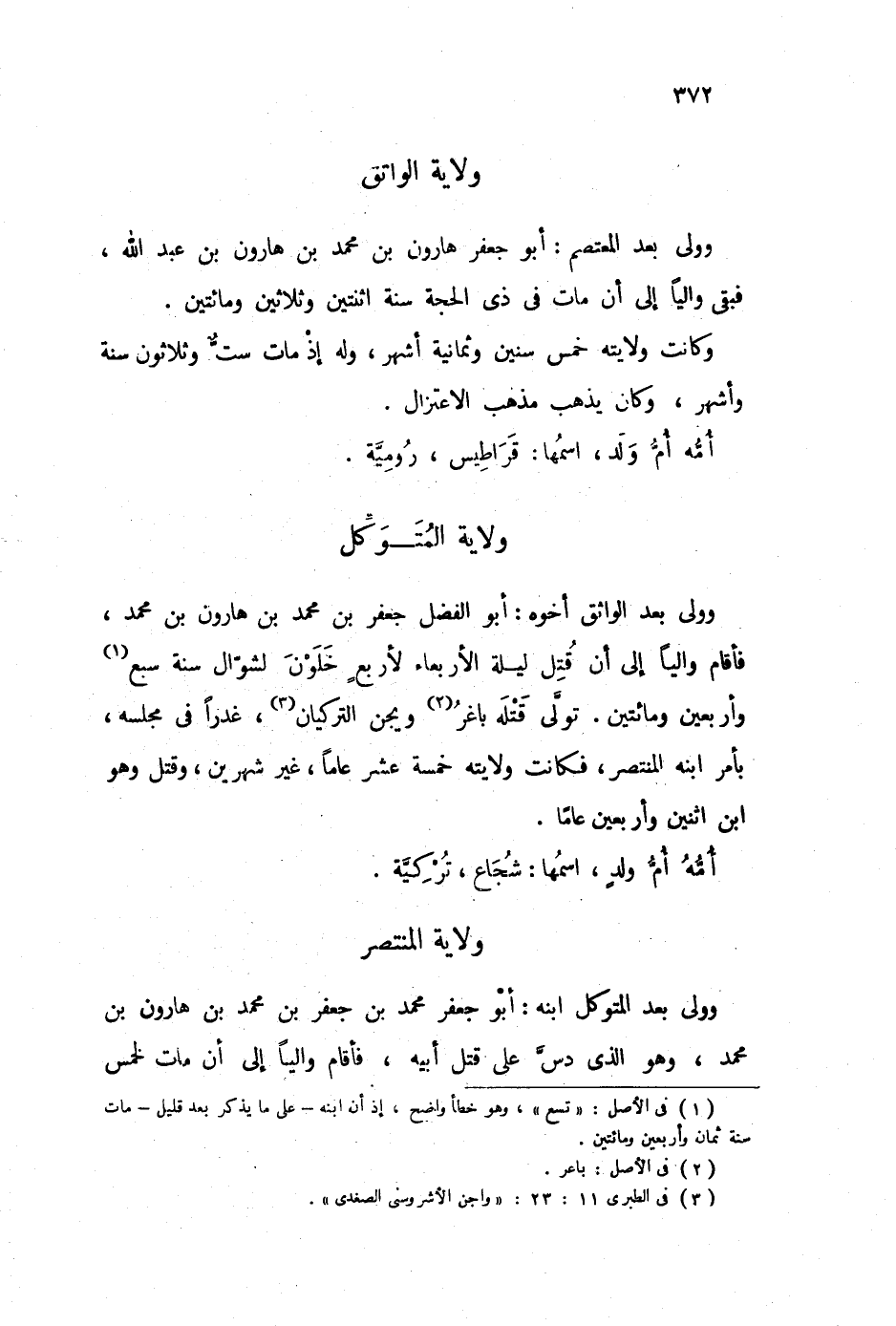 وولي بعد الواثق أخوه: أبو الفضل جعفر بن محمد بن هارون بن محمد، فقام والياً إلى أن قتل ليلة الأربعاء لأربع خلون لشوال سنة سبع (1) وأربعين ومائتين. تولى قتله باغر (2) ويجن التركيان (3) ، غدراً في مجلسه، بأمر ابنه المنتصر، فكانت ولايته خمسة عشر عاماً، غير شهرين، وقتل وهو ابن اثنين وأربعين.
