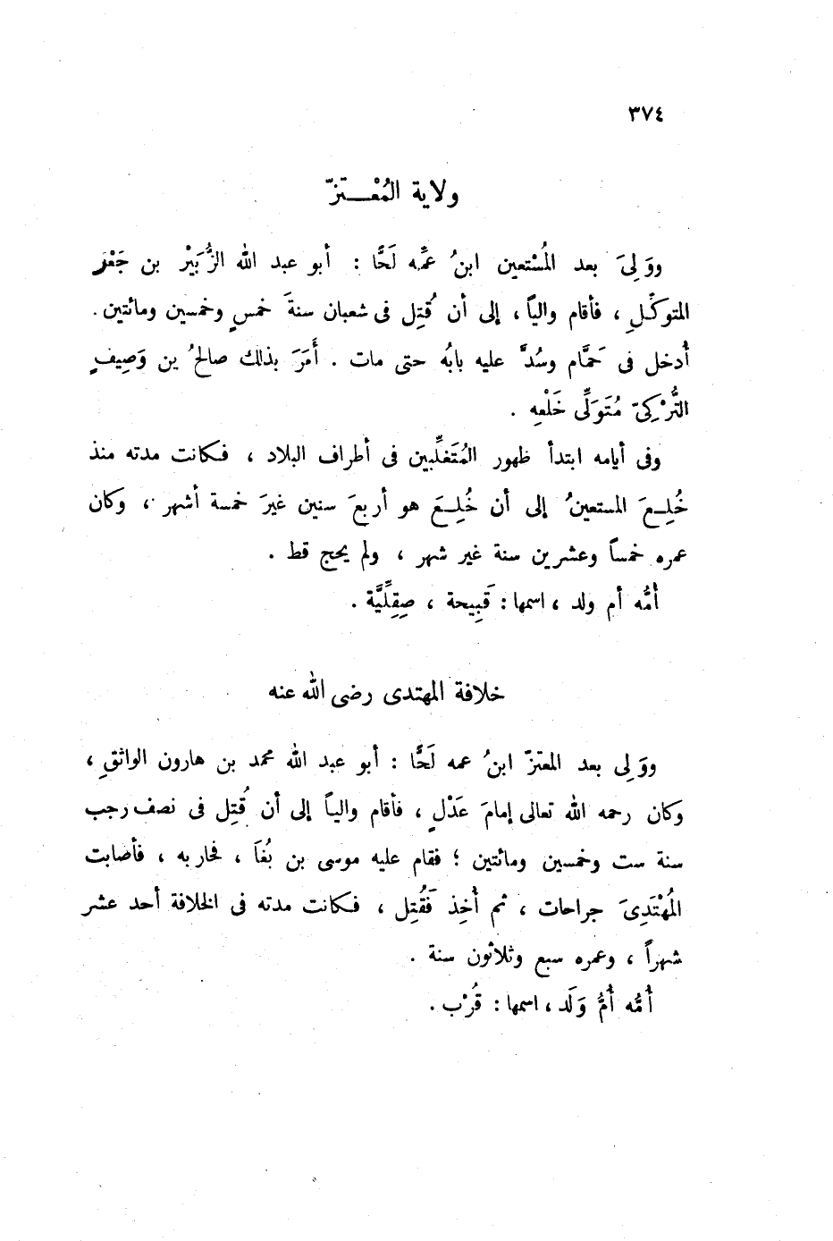 وولي بعد المعتز ابن عمه لحا: أبو عبد الله محمد بن هارون الواثق، وكان رحمه الله تعالى إمام عدل، فأقام والياً إلى قتل في نصف رجب سنة ست وخمسين ومائتين؛ فقام عليه موسى بن بغا، فحاربه، فأصابت المهتدي جراحات، ثم أخذ فقتل، فكانت مدته في الخلافة أحد عشر شهراً، وعمره سبع وثلاثون سنة.