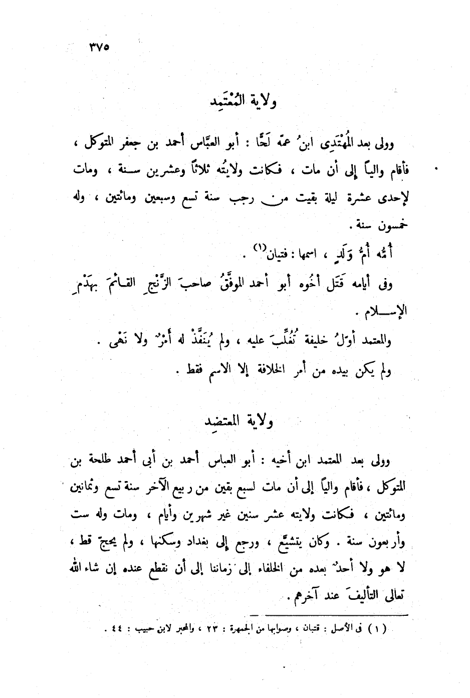 وولي بعد المعتمد ابن أخيه: أبو العباس أحمد بن أبي أحمد طلحة بن المتوكل، فأقام والياً إلى أن مات لسبع بقين من ربيع الآخر سنة تسع وثمانين ومائتين، فكانت ولايته عشر سنين غير شهرين وأيام، ومات وله ست وأربعون سنة. وكانت يتشيع، ورجع إلى بغداد وسكنها، ولم يحج قط، لا هو ولا أحد بعده من الخلفاء إلى زماننا إلى أن نقطع عنده إن شاء الله تعالى التأليف عند آخرهم.