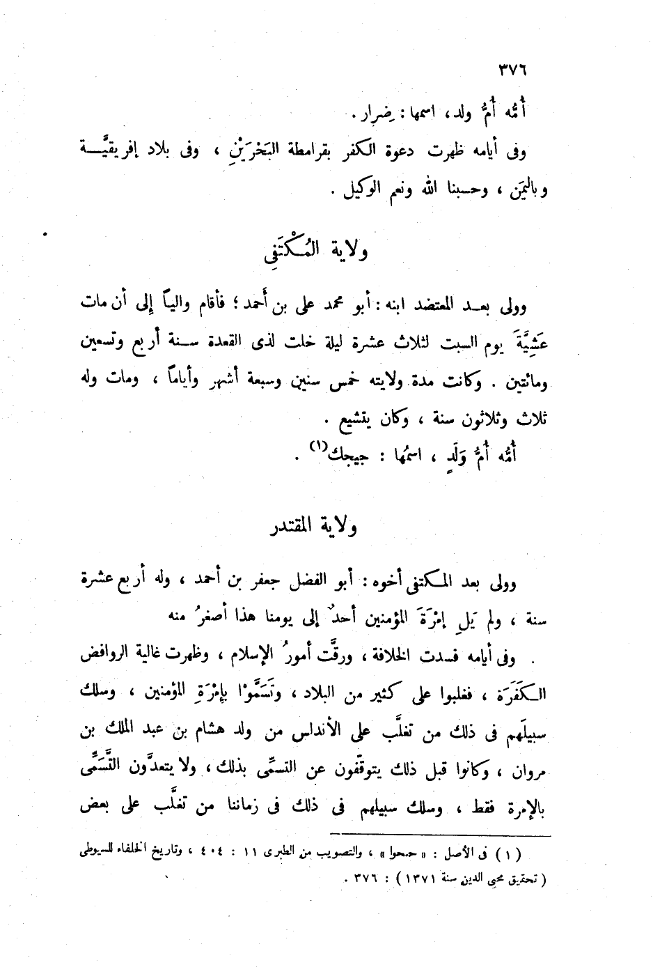 وولي بعد المكتفي أخوه: أبو الفضل جعفر بن أحمد، وله أربع عشرة سنة، ولم يل إمرة المؤمنين أحد إلى يومنا هذا أصغر منه.