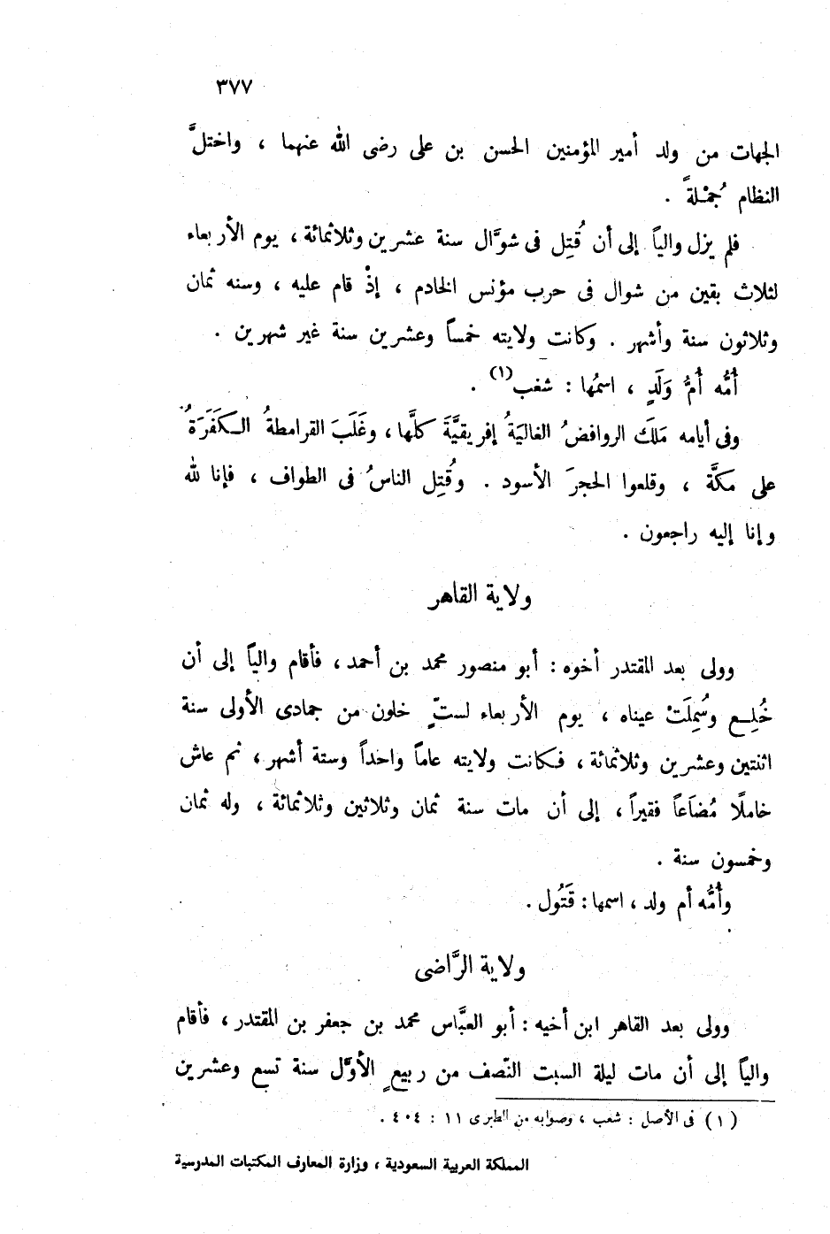 وفي أيامه ملك الروافض الغالية إفريقية كلها، وغلب القرامطة الكفرة على مكة، وقلعوا الحجر الأسود. وقتل الناس في الطواف، فإنا لله وإنا إليه راجعون.