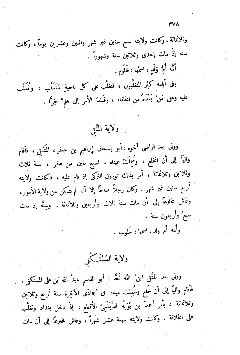 وولي بعد الراضي أخوه: أبو إسحاق إبراهيم بن جعفر، المتقي، فأقام والياً إلى أن انخلع، وسملت عيناه، لسبع بقين من صفر، سنة ثلاث وثلاثين وثلاثمائة، أمر بذلك توزون التركي إذ قام عليه، فكانت ولايته أربع سنين غير شهر. وكان رجلاً صالحاً إلا أنه لم يتمكن من ولاية الأمور، وعاش مخلوعاً إلى أن مات سنة ثلاث وأربعين وثلاثمائة. وسنه إذ مات سبع وأربعون سنة.