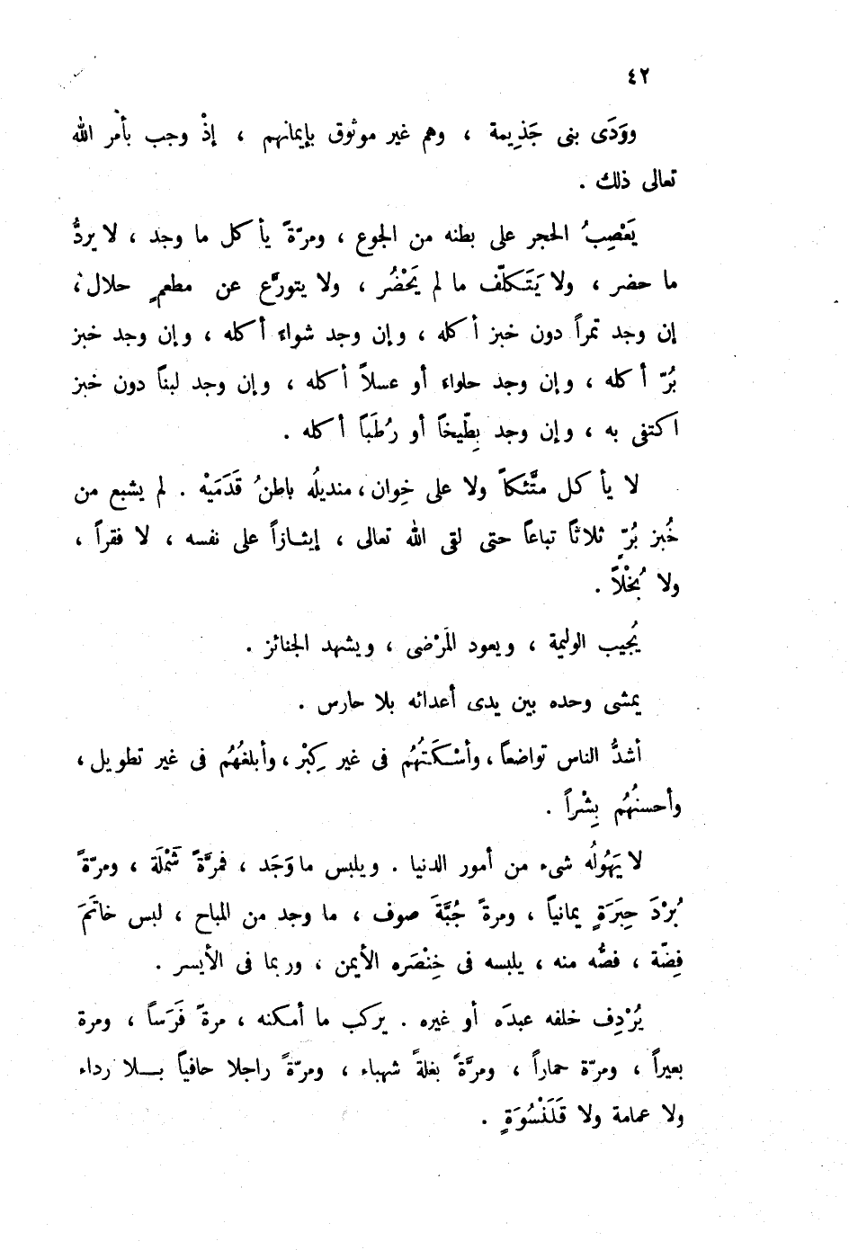 لا يأكل متئكاً ولا على خوان، منديله باطن قدميه. لم يشبع من خبز بر ثلاثاً تباعاً حتى لقي الله تعالى، إيثاراً على نفسه، لا فقراً، ولا بخلاً.