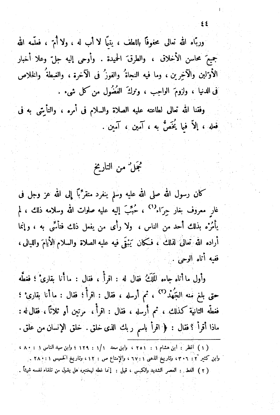 (1) انظر: ابن هشام 1: 251، وابن سعد 1 / 1: 129؛ وابن سيد الناس 1: 80، وابن كثير 2: 306، وتاريخ الذهبي 1: 67، والإمتاع ص: 12، وتاريخ الخميس 1: 280.