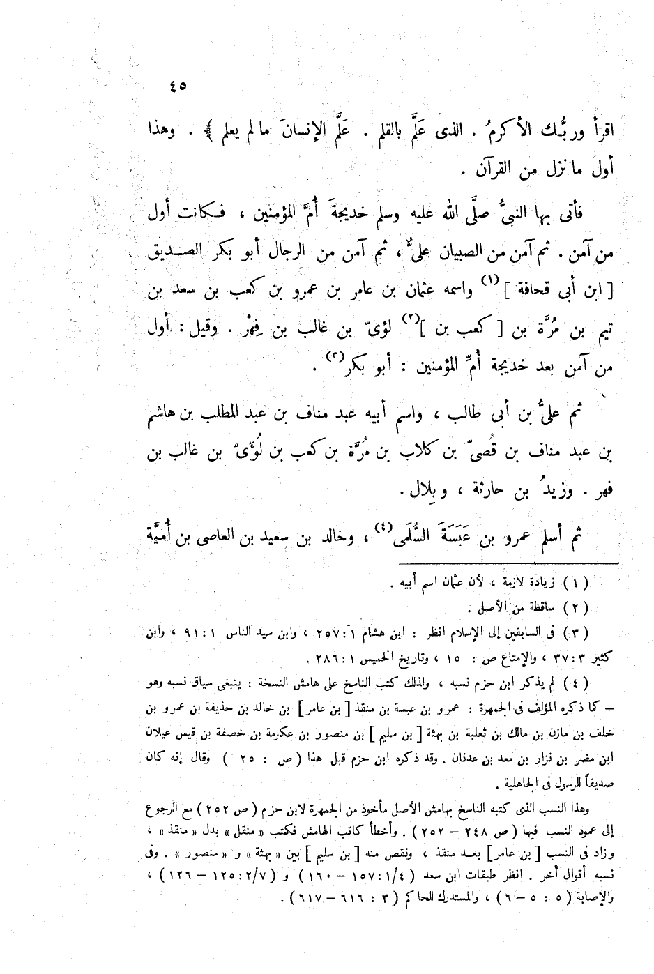 (3) في السابقين إلى الإسلام انظر: ابن هشام 1: 257، وابن سيد الناس 1: 91، وابن كثير 3: 37، والإمتاع ص: 15، وتاريخ الخميس 1: 286.