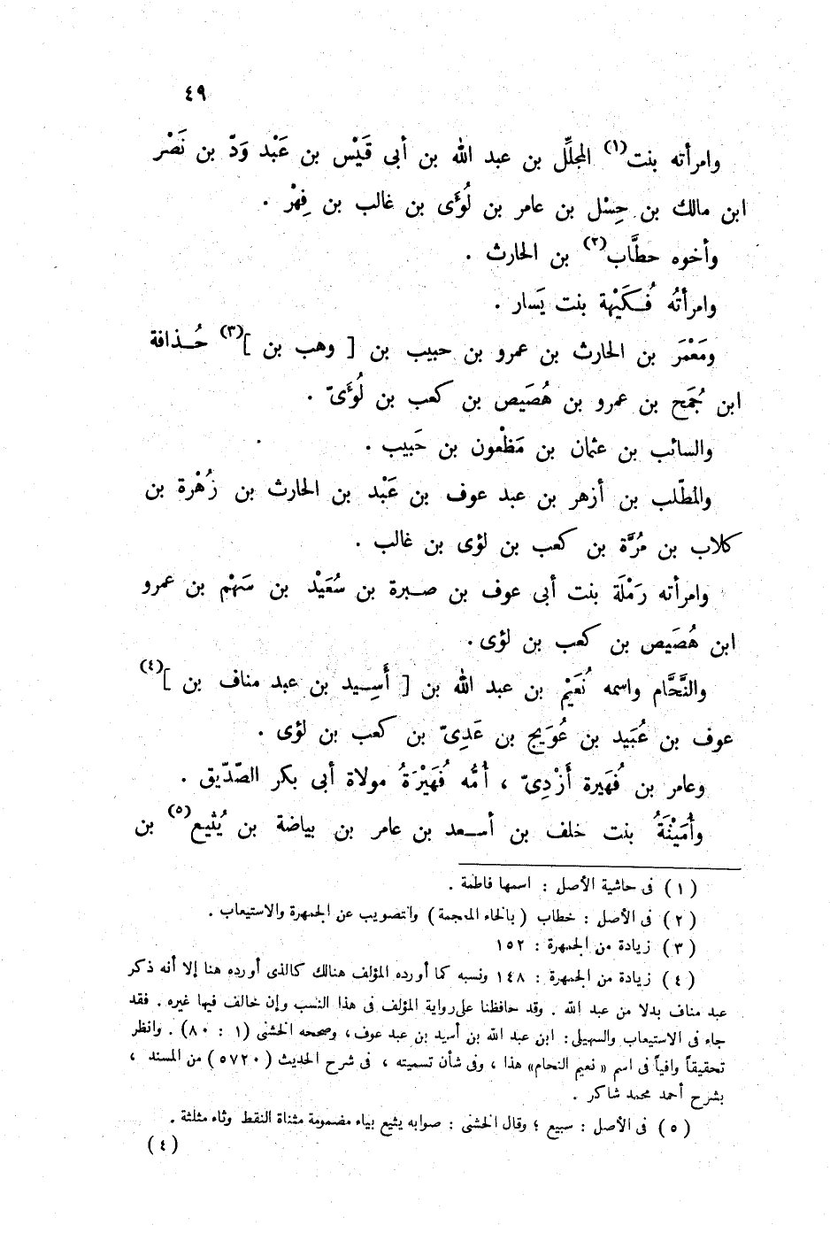 (4) زيادة من الجمهرة: 148 ونسبه كما أورده المؤلف هنالك كالذي أورده هنا إلا أنه ذكر عبد مناف بدلا من عبد الله. وقد حافظنا على رواية المؤلف في هذا النسب وإن خالف فيها غيره. فقد جاء في الاستيعاب والسهيل: ابن عبد الله بن أسيد بن عبد عوف، وصححه الخشني (1: 80) . وانظر تحقيقاً وافياً في اسم " نعيم النحام " هذا، وفي شأن تسميته، في شرح الحديث (5720) من المسند، بشرح أحمد محمد شاكر.