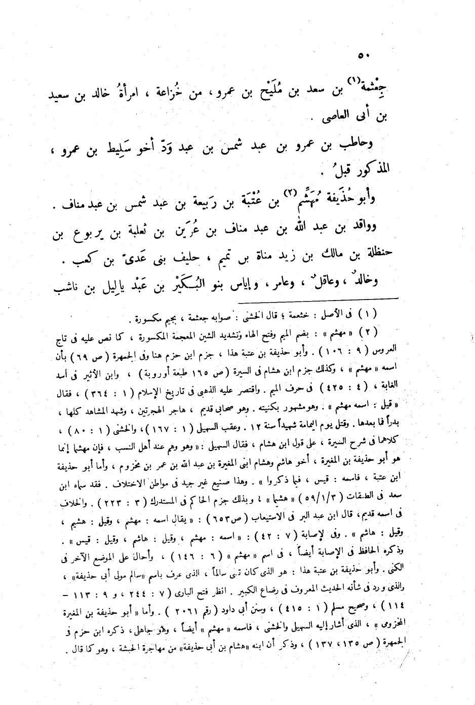 (2) " مهشم ": بضم الميم وفتح الهاء وتشديد الشين المعجمة المكسورة، كما نص عليه في تاج العروس (9: 106) . وأبو حذيفة بن عتبة هذا، جزم ابن حزم هنا وفي الجمهرة (ص: 69) بأن اسمه " مهشم "، وكذلك جزم ابن هشام في السيرة (ص 165 طبعة أوروبة) ، وابن الأثير في أسد الغابة، (4: 425) في حرف الميم. واقتصر عليه الذهبي في تاريخ الإسلام (1: 364) ، فقال " قيل: اسمه مهشم ". وهو مشهور بكنيته. وهو صحابي قديم، هاجر الهجرتين، وشهد المشاهد كلها، بدراً فما بعدها. وقتل يوم اليمامة شهيداً سنة 12. وعقب السهيل (1: 167) ، والخشني (1: 80) ، كلاهما في شرح السيرة، على قول ابن هشام، فقال السهيلي: " وهو وهم عند أهل النسب، فإن مهشما إنما هو أبو حذيفة بن المغيرة، أخو هاشم وهشام ابني المغيرة بن عد الله بن عمر بن مخزوم، وأما أبو حذيفة ابن عتبة، فاسمه: قيس، فيما ذكروا ". وهذا صنيع غير جيد في مواطن الاختلاف. فقد سماه ابن سعد في الطبقات (3 / 1 / 59) " هشيما " وبذلك جزم الحاكم في المستدرك (3: 223) . والخلاف في اسمه قديم، قال ابن عبد البر في الاستيعاب (ص 653) : " يقال اسمه: مهشم، وقيل: هشيم، وقيل: هاشم ". وفي الإصابة (7: 42) : " اسمه: مهشم، وقيل: هاشم، وقيل: قيس ". وذكره الحافظ في الإصابة أيضاً، في اسم " مهشيم " (6: 146) ، وأحال على الموضع الآخر في الكنى. وأبو حذيفة بن عتبة هذا: هو الذي كان تبنى سالماً، الذي عرف باسم " سالم مولى أبي حذيفة "، والذي ورد شأنه الحديث المعروف في رضاع الكبير. انظر فتح الباري (7: 244، و 9: 113 - 114) ، وصحيح مسلم (1: 415) ، وسنن أبي داود (رقم 2061) . وأما " أبو حذيفة بن المغيرة المخزومي "، الذي أشار إليه السهيل والخشني، فاسمه " مهشم " أيضاً، وهو جاهل، وذكره ابن حزم في الجمهرة (ص 135، 137) ، وذكر أن ابنه " هشام بن أبي حذيفة " من مهاجرة الحبشة، وهو كما قال.