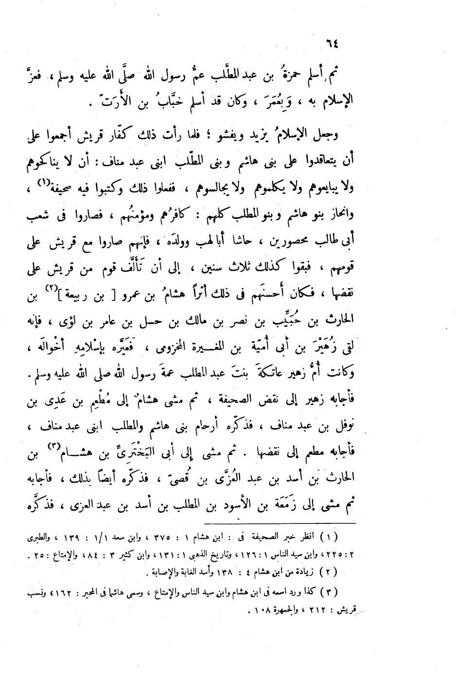 (1) انظر خبر الصحيفة في: ابن هشام 1: 375، وابن سعد 1 / 1: 139، والطبري 2: 225، وابن سيد الناس 1: 126، وتاريخ الذهبي 1: 131، وابن كثير 3: 84، والإمتاع: 25.