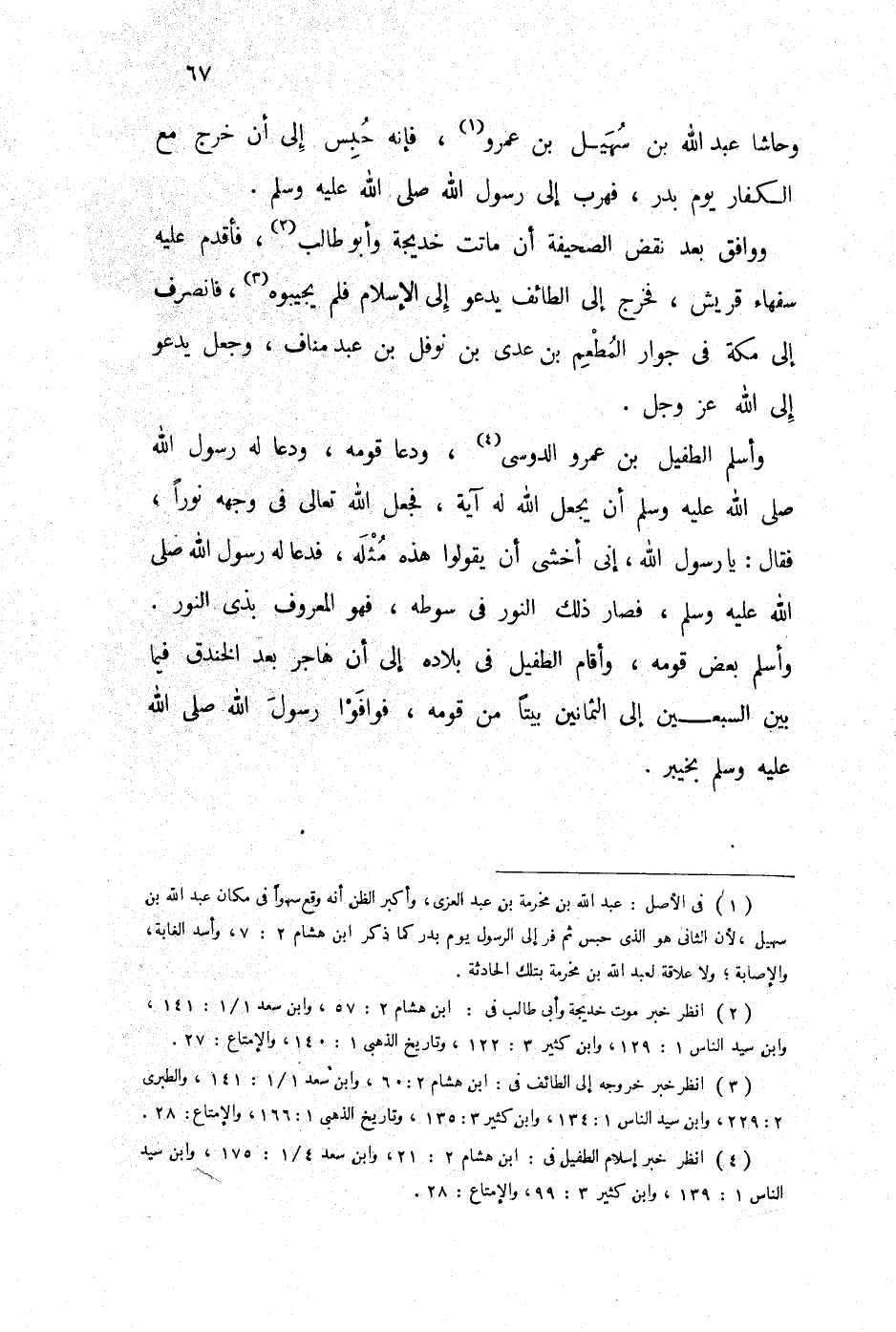 (4) انظر خبر إسلام الطفيل في: ابن هشام 2: 21، وابن سعد 4 / 1: 175، وابن سيد الناس 1: 139، وابن كثير 3: 99، والإمتاع: 28.