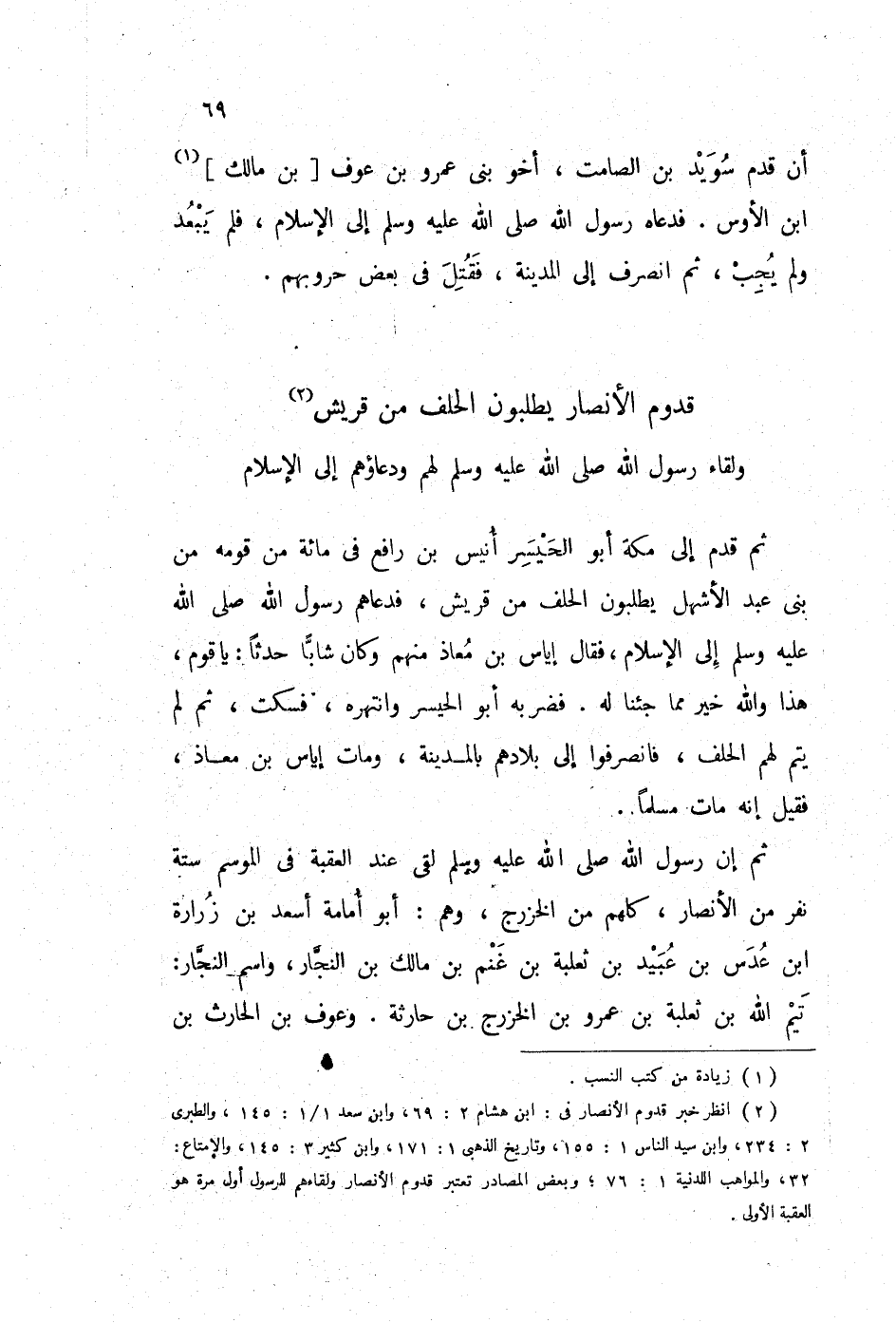 (2) انظر خبر قدوم الأنصار في: ابن هشام 2: 69، وابن سعد 1 / 1: 145، والطبري 2: 234، وابن سيد الناس 1: 155، وتاريخ الذهبي 1: 171، وابن كثير 3: 145، والإمتاع: 32، والمواهب اللدنية 1: 76؛ وبعض المصادر تعتبر قدوم الأنصار ولقاءهم للرسول أول مرة هو العقبة الأولى.