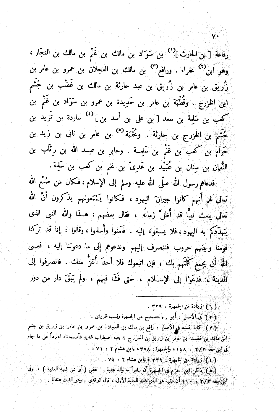 (3) كان نسبه في الأصل: رافع بن مالك بن العجلان بن عمرو بن عامر بن زريق بن جشم ابن مالك بن غضب بن عامر بن زريق بن الخزرج؛ وفيه اضطراب شديد فأصلحناه اعتماداً على ما جاء في ابن سعد 3 / 2: 148، والجمهرة: 378، وابن هشام 2: 71.