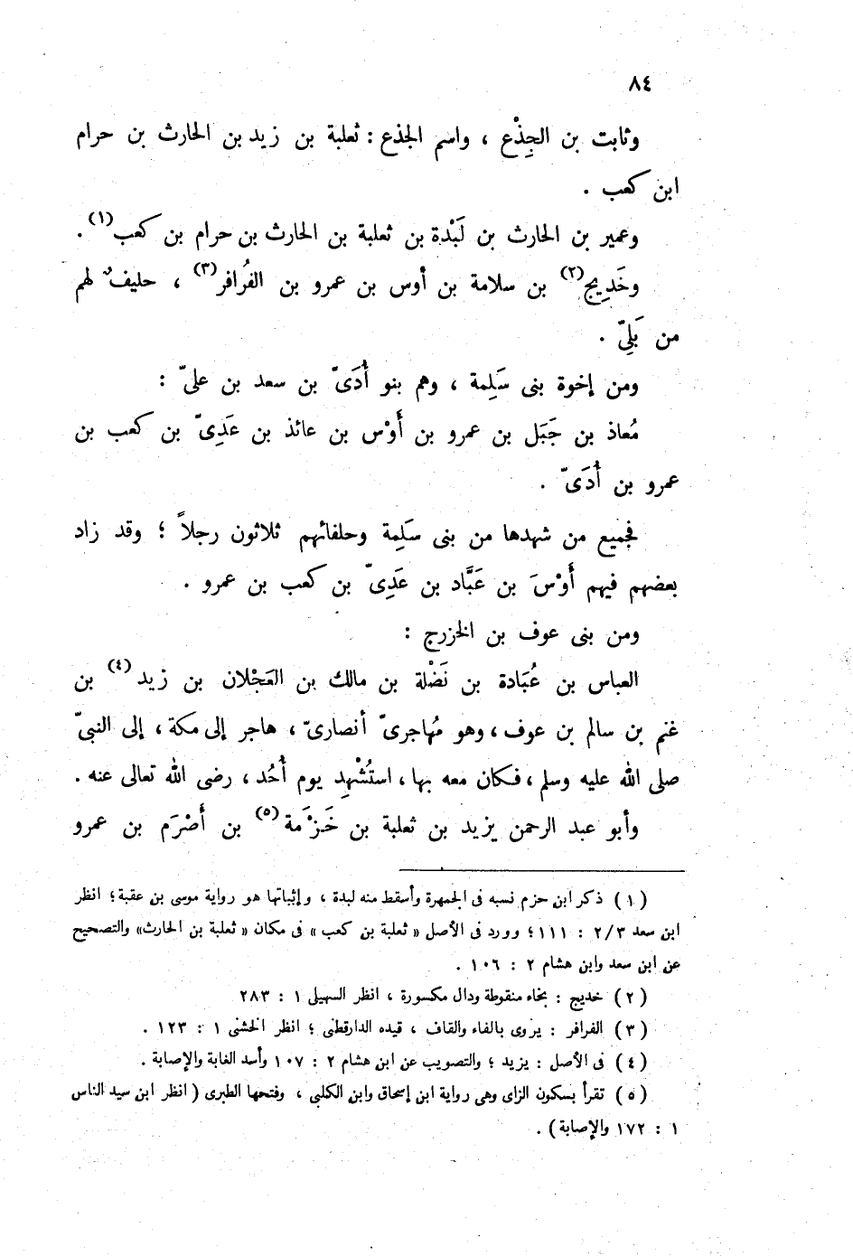 (1) ذكر ابن حزم نسبه في الجمهرة وأسقط منه لبدة، وإثباتها هو رواية موسى بن عقبة؛ انظر ابن سعد 3 / 2: 111؛ وورد في الأصل " ثعلبة بن كعب " في مكان " ثعلبة بن الحارث " والتصحيح عن ابن سعد وابن هشام 2: 106.