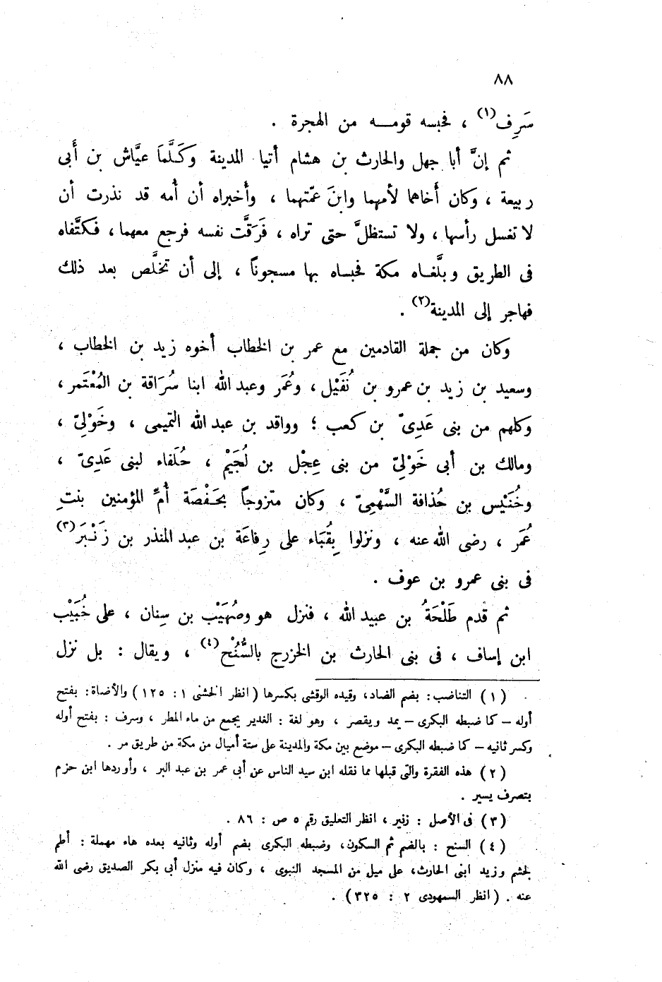 (4) السنح: بالضم ثم السكون، وضبطه البكري بضم أوله وثانيه بعده هاء مهملة: أطم لجشم وزيد ابني الحارث، على ميل من المسجد النبوي، وكان فيه منزل أبي بكر الصديق رضي الله عنه. (انظر السمهودي 2: 325) .