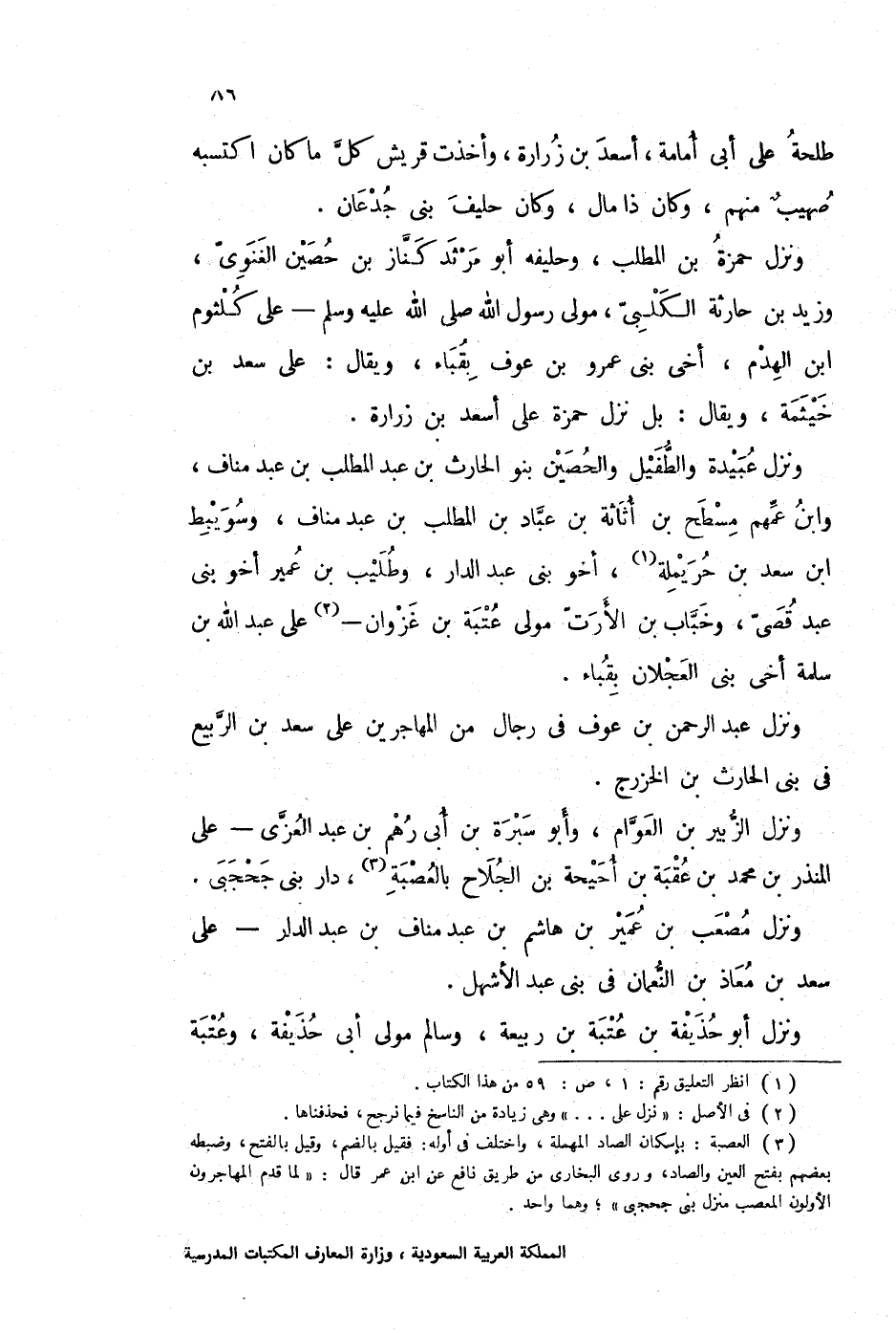 (3) العصبة: بإسكان الصاد المهملة، واختلف في أوله: فقيل بالضم، وقيل بالفتح، وضبطه بعضهم بفتح العين والصاد، وروى البخاري من طريق نافع عن ابن عمر قال: " لما قدم المهاجرون الأولون المعصب منزل بني جحجبي "؛ وهما واحد.