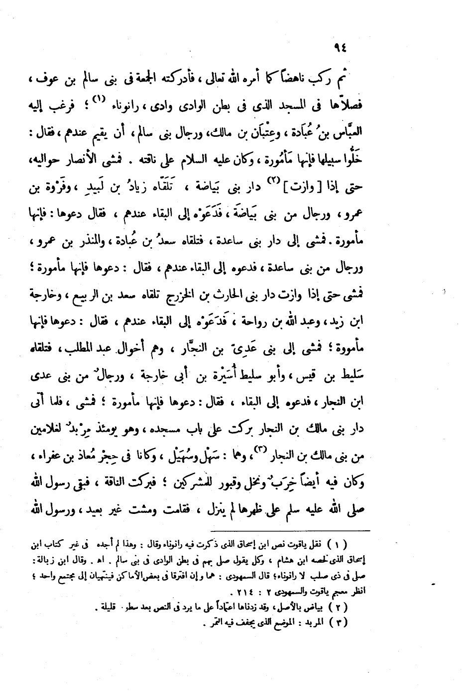ثم ركب ناهضاً كما أمره الله تعالى، فأدركته الجمعة في بني سالم بن عوف، فصلاها في المسجد الذي في بطن الوادي وادي، رانوناء (1) ؛ فرغب إليه العباس بن عبادة، وعتبان بن مالك، ورجال بني سالم، أن يقيم عندهم، فقال: خلوا سبيلها فإنها مأمورة، وكان عليه السلام على ناقته. فمشى الأنصار حواليه، حتى إذا [وازت] (2) دار بني بياضة، تلقاه زياد بن لبيد، وفروة بن عمرو، ورجال من بني بياضة، فدعوه إلى البقاء عندهم، فقال دعوها: فإنها مأمورة. فمشى إلى دار بني ساعدة، فتلقاه سعد بن عبادة، والمنذر بن عمرو، ورجال من بني ساعدة، فدعوه إلى البقاء عندهم، فقال: دعوها فإنها مأمورة؛ فمشى حتى إذا وازت دار بني الحارث بن الخزرج تلقاه سعد بن الربيع، وخارجة ابن زيد، وعبد الله بن رواحة، فدعوه إلى البقاء عندهم، فقال: دعوها فإنها مأمورة؛ فمشى إلى بني عدي بن النجار، وهم أخوال عبد المطلب، فتلقاه سليط بن قيس، وأبو سليط أسيرة بن أبي خارجة، ورجال من بني عدي ابن النجار، فدعوه إلى البقاء، فقال دعوها فإنها مأمورة؛ فمشى، فلما أتى دار بني مالك بن النجار بركت على باب مسجده، وهو يومئذ مربد لغلامين من بني مالك بن النجار (3) ، وهما: سهل وسهيل، وكانا في حجر معاذ بن عفراء، وكان فيه أيضاً خرب ونخل وقبور للمشركين؛ فبركت الناقة، فبقى رسول الله صلى الله عليه وسلم على ظهرها لم ينزل، فقامت ومشت غير بعيد، ورسول الله