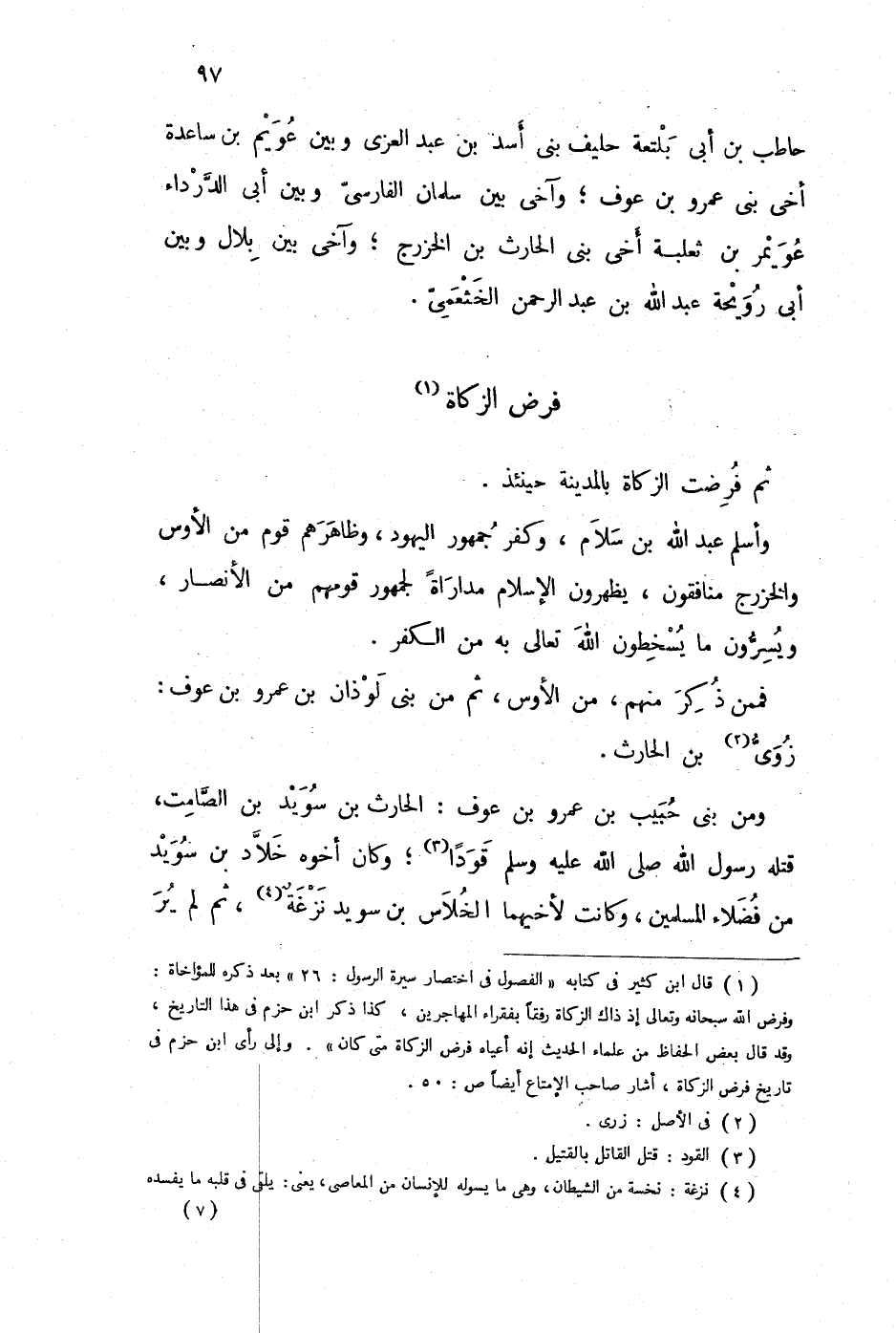 (1) قال ابن كثير في كتابه " الفصول في اختصار سيرة الرسول: 26 " بعد ذكره للمؤاخاة: وفرض الله سبحانه وتعالى إذ ذاك الزكاة رفقاً بفقراء المهاجرين، كذا ذكر ابن حزم في هذا التاريخ، وقد قال بعض الحفاظ من علماء الحديث إنه أعياه فرض الزكاة متى كان ". وإلى رأي ابن حزم في تاريخ فرض الزكاة، أشار صاحب الإمتاع أيضاً ص: 50.
