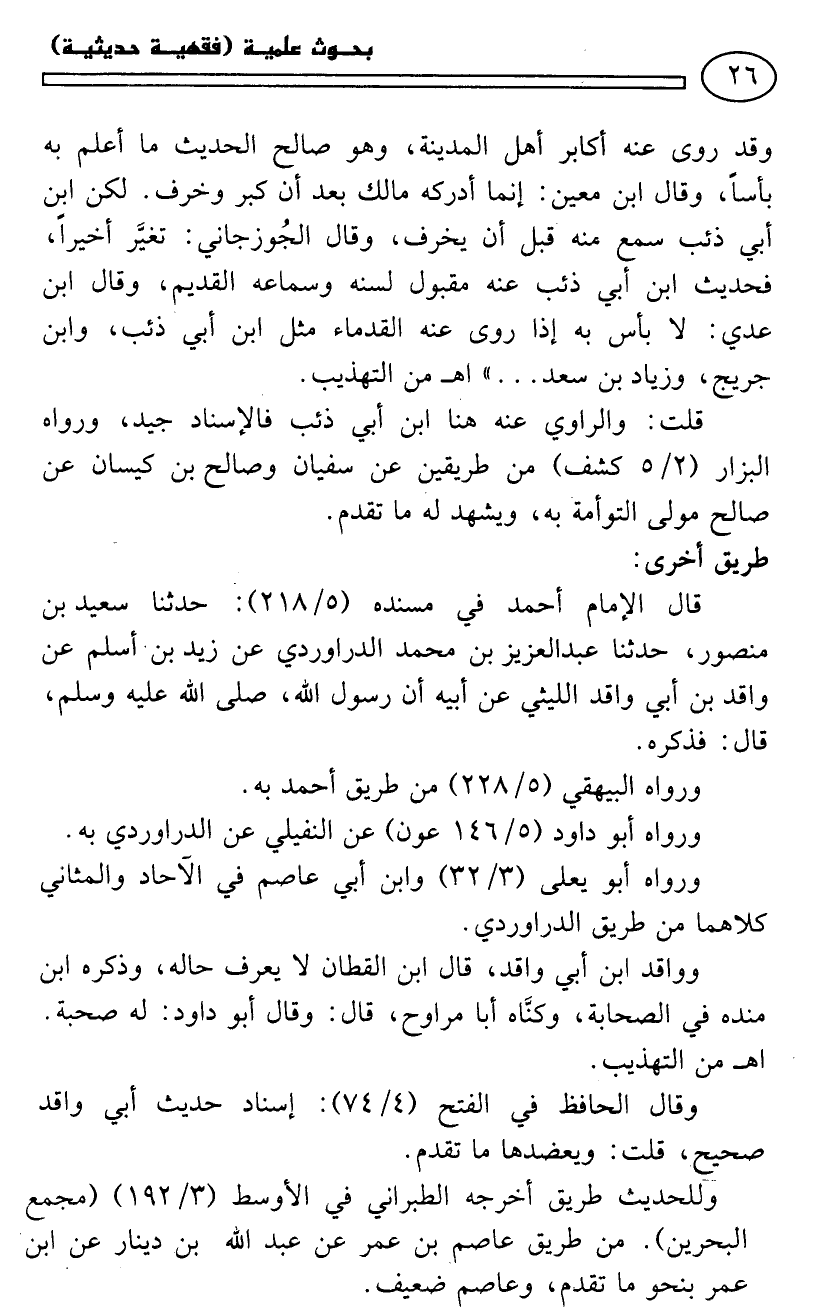 قال الإمام أحمد في «مسنده» (5/ 218): حدثنا سعيد بن منصور، حدثنا عبد العزيز ابن محمد الدراوردي عن زيد بن أسلم عن واقد بن أبي واقد الليثي عن أبيه أن رسول الله - صلى الله عليه وسلم - قال: فذكره.