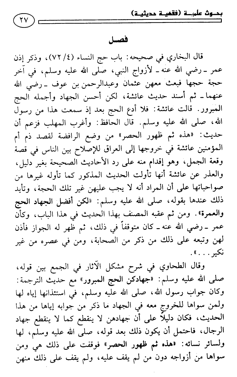 قال عائشة: فلا أدع الحج بعد إذ سمعت هذا من رسول الله - صلى الله عليه وسلم -. قال الحافظ: وأغرب المهلب فزعم أن حديث: «هذه ثم ظهور الحصر» من وضع الرافضة لقصد ذم أم المؤمنين عائشة في خروجها إلى العراق للإصلاح بين الناس في قصة وقعة الجمل، وهو إقدام منه على رد الأحاديث الصحيحة بغير دليل، والعذر عن عائشة أنها تأولت الحديث المذكور كما تأوله غيرها من صواحباتها على أن المراد أنه لا يجب عليهن غير تلك الحجة، وتأيد ذلك عندها بقوله - صلى الله عليه وسلم -: «لكن أفضل الجهاد الحج والعمرة». ومن ثم عقبه المصنف بهذا الحديث في هذا الباب، وكأن عمر سدد خطاكم كان متوقفًا في ذلك، ثم ظهر له الجواز فأذن لهن وتبعه على ذلك من ذكر من الصحابة، ومن في عصره من غير نكير ..». .