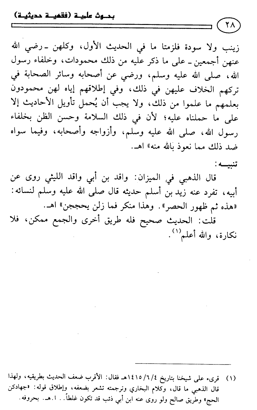 (¬1) قرئ على شيخنا بتاريخ 4/ 6/1415هـ فقال: الأقرب ضعف الحديث بطريقيه، ولهذا قال الذهبي ما قال، وكلام البخاري وترجمته تشعر بضعفه، وإطلاق قوله: «جهادكن الحج» وطريق صالح ولو روى عنه ابن أبي ذئب قد تكون غلطًا. اهـ. بحروفه.