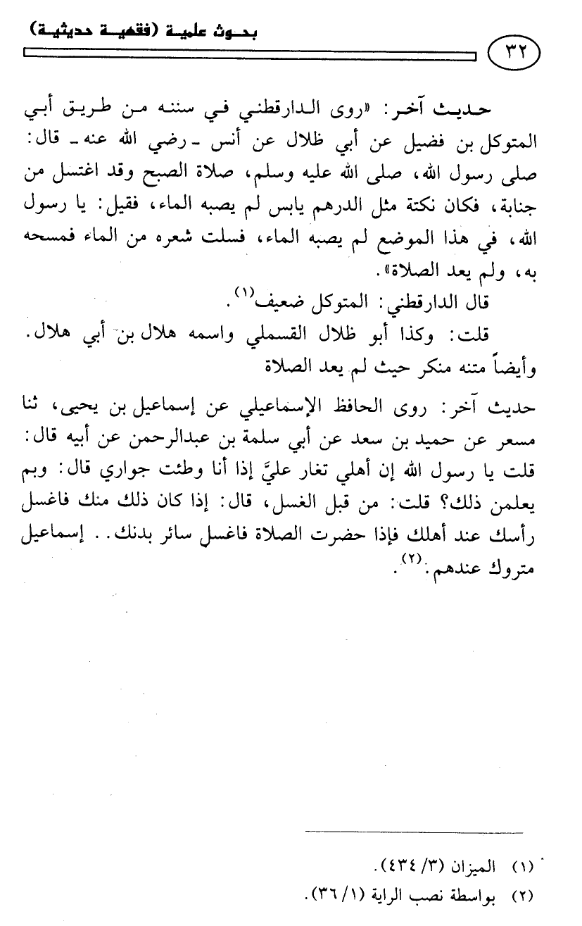 حديث آخر: «روى الدارقطني في سننه من طريق أبي المتوكل بن فضيل عن أبي ظلال عن أنس سدد خطاكم قال: صلى رسول الله - صلى الله عليه وسلم - صلاة الصبح وقد اغتسل من جنابة، فكان نكتة مثل الدرهم يابس لم يصبه الماء، فقيل: يا رسول الله، في هذا الموضع لم يصبه الماء، فسلت شعره من الماء فمسحه به، ولم يعد الصلاة».